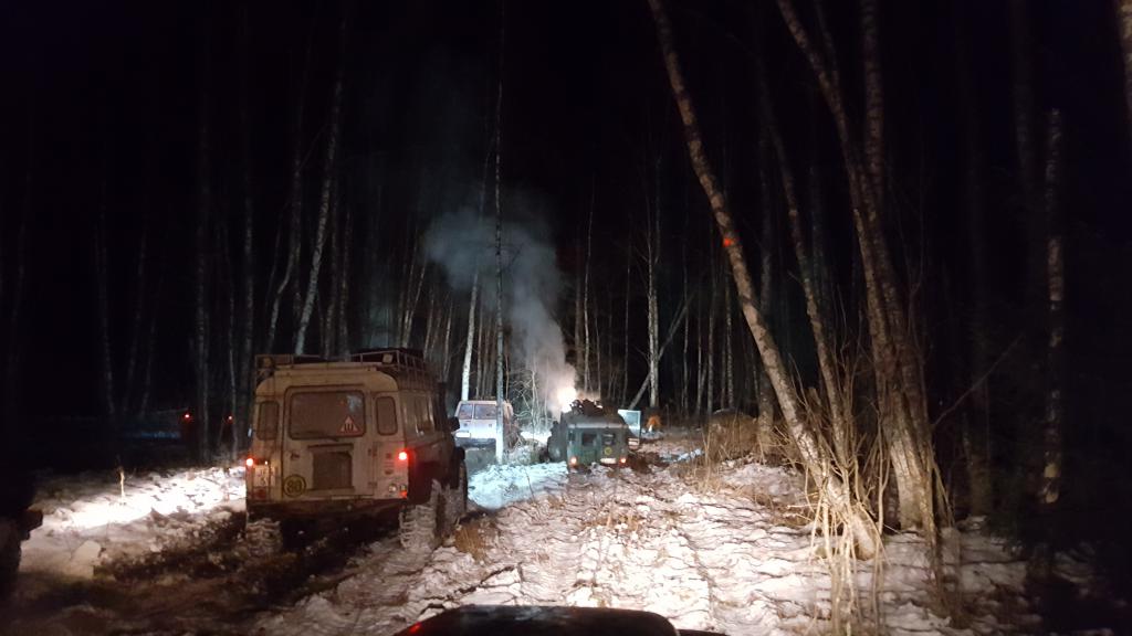 Aamulla nousin teltasta noin kymmenen aikaan, yllättäen ensimmäisenä. Puolijoukkue teltta oli yön aikana ilmestynyt viereen ja olin sen pystyttämisestä autuaan tietämätön. Keli oli lämmennyt ja teltassa oli kosteusprosentti kohdallaan. Makuupussi oli jo pinnasta märkä, ei auttanut, kun sulloa se sellaisenaan suojapussiinsa. Teltta meni sekin märkänä rullalle, tarkoitus oli yöpyä jatkossa PJ-teltassa. Aamupalaksi käristin nuotiolla pekonia ja kananmunia, niillä jaksaisi pitkälle iltaan. Aikamme arvottiin päivän reittiä ja päädyttiin siihen, että leiri jää paikalleen. Ilkka jää leiriin purkamaan mersua ja loput lähtee ajamaan lähistöllä olevaa suon kiertoa. Alkuun tavoiteltiin ajamattomalle reitille suon pohjoispuolelta mutta vanhaa uraa ei löytynyt. Oikeastaan luovutettiin liian helpolla, tukkitielle oli kaatunut iso kuusi, eikä jaksettu sitä sahata, kun tie meni muutenkin väärään suuntaan kartan mukaan. Otettiin suunta etelään ja kohti aikaisemmin ajettua reittiä. Metsätyöt olivat aiheuttaneet sen, ettei paikat olleet yhtään tutun näköisiä. Muistin hyvin tarkasti paikan josta vuosi pari sitten Kauko HZJ:lla yritti oikealle reitille, mutta vinssattiin takaisin, kun keula sukelsi ojaan. Sitten ajeltiin umpiryteikköjä pitkin erään talon raunioille. Yksi tavoite oli löytää tähän parempi vaihtoehto, eli alkuperäinen tieura. Muuttunut ympäristö ja harhaanjohtava GPS aiheuttivat sen, ettei pätkän alkua löytynyt. Tajusin vasta jonkin kilometrin päästä, että kartalle piirtyvä viiva ei vastaa todellisuutta. Auto oli paikallaan mutta kartan mukaan liikuttiin eteenpäin. Päätettiin lähteä hakemaan reittiä suon länsipuolelta niin ikään ajamattomilta katkoviivoilta. Heivasin huonosti toimivan Android tabletin ja nostin tilalle aikaisemmin käytössä olleen Windows tabletin. Tosin sekään ei ollut ongelmaton, kun USB portissa oleva GPS meni vähän väliä jumiin. Varmistuksena oli kännykässä OziExplorer ja se piirsi koko reissun virheetöntä reittiviivaa. Tonttilan Lasse, Ukkosen Kimmo ja Hattu-Vesku, alkoi pian kuulua LA puhelimesta. Jäätiin odottelemaan heitä Heinjoelta tulevan hiekkatien varteen. Letka saatiin kasaan ja jatkettiin kohti pohjoista. Reittiä ei tuntunut kovin helpolla löytyvän, joten jäätiin pitämään ruokataukoa niitylle. Niityltä koitettiin vielä hakea reittiä kohti alkuperäistä suuntaa mutta tuloksetta, edessä oli vain umpimetsää. Ajettiin tietä pitkin vähän eteenpäin ja poikettiin metsään seuraavalle selvälle uralle. Ensimmäinen haara johti hakkuuaukealle, jälki kuitenkin katosi eikä lähdetty kannokkoon etsimään sitä. Valittiin seuraava ura, joka meni vähän pidemmälle mutta päättyi aukkoon sekin. Sateliittikuvista näki, että metsää olisi välissä vain sata metriä mutta niin tiheää ettei kannattaisi pimeässä yrittää. Koilisen suuntaan olisi myös ura, vieden aukealle, mutta mitään selvää määränpäätä ei ollut. Uusi suunnitelma, palataan takaisin paikkaan josta alkuperin ajettu viiva olisi lähtenyt. Matkan varrella, paikallinen kuljettaja oli pulassa ylämäessä, vaikka takarenkaat oli varustettu ketjuilla. Tarjottiin apua mutta kertoi traktorin olevan jo matkalla. Auto oli betonilastissa, joten painoa saattoi olla jonkin verran. Saavuttuamme määränpäähän, latasin vanhan reitin Lassen koneelle ja hän lähti etsimään sitä. Huomasin että tulomatkalla käytössä olleen Android tabletin GPS oli seilannut ihan omilla laduillaan ja on selvää, että reitti alkaakin melkein sata metriä luultua aikaisemmin. Metsästä löytyi selkeä pehmeä ura, jota pitkin päästiin halutulle katkoviivatielle. Osa porukasta erkani letkasta ja palasi leiriin viemään Ilkalle varaosia. LA puhelimesta kuultiin pian, että leiriä kohti suuntaavasta letkasta "isokissa" Defender oli ojassa kyljellään, liekö tullut kuskille ohjausvirhe. Reitti nousi aavistuksen mäkeen ja pian edellä olevista autosta alkoi säntäillä miehistöä pihalle. Ensimmäisenä ollut Suzuki oli kyljellään jossain kuopassa. Lasse osui pimeässä niin syvään monttuun, että auto heilahti sen pohjalle kyljelleen, apukuskin puolelle tietenkin. Samu Hiluxilla koitti ajaa vasemmalta ohi mutta sielläkin oli vastassa monttu. Suzuki vinssattiin lopulta renkailleen, kun ensin oli otettu pari valokuvaa todistusaineistoksi. Suzuki ehti olla kyljellään niin kauan, että tulpat poistetiin ennen käynnistystä. Startatessa tulpan reistä roiskui öljyä monen metrin korkeuteen viereisen männyn kylkeen. Putsari otettiin irti ja imusarja oli vieläkin täynnä öljyä. Suurimmat määrät imeytettiin rätteihin ja suodatinta koitettiin pestä öljystä. Lopulta uskallettiin lyödä romut nippuun ja kone tulille. Suzuki tupsutteli vähän öljyistä ja haisevaa pakokaasua mutta toimi kuitenkin. Päästiin vihdoin jatkamaan matkaa. Pian tavoitettiin Kuntola nimisen tiluksen rauniot, jossa aikaisemmin ajettu reitti yhtyi nykyiseen. Siitä eteenpäin päästiin kiimasuon laitaan melko tarkasti kartan viivaa pitkin ja edessä oli jo parempi tie. Karpalosuon kohdalta poikettiin metsään, hakemaan uutta reittiä, josta päästäisiin kiertämään kiimasuo yläkautta. Ajettiin umpimetsää, kunnes tuli liian tiheää eikä lumessa ja pimeässä reittiä löytynyt helposti. Lasse ja Janne kävelivät monta sataa metriä etsien mahdollista ajoreittiä. Jonkinlainen ura kuitenkin pitäisi olla koska Lehtola niminen talo oli aivan suon pohjoispäässä. Karttojen ollessa ajalta ennen toista maailmansotaa, ehtii urat kasvaa umpeen. Päätettiin kellon ollessa jo paljon kääntyä takaisin tutulle tieuralle. Välissä oli sopivasti pieni suo, josta BJ meni tyhjäkäynnillä nipin napin yli, ja Lassen Suzuki jäi vasta aivan lopussa kiinni. Loppu letka tuli suurimman osan matkaa vinssillä. Ajoivat ehkä liikaa samoihin uriin tai muuten vaan löysivät ne pehmeät kohdat. Vinssit olivat kovill