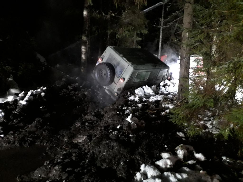 Perjantai 1.12.2017 Perinteeksi muodostunut In-Teamin / Päijät-Hämeen Maastoautoilijoiden itsenäisyyspäivän Venäjän safari ajettiin 1 - 6.12.2017. Kohteena luovutettu Karjalan Kannas, tarkemmin mm. Antrea, Heinjoki, Äyräpää, Räisälä ja Vuoksenranta. Reissun piti olla talveen sopivaa normaalia kevyempää safarointia ja leireilyä. Melkein onnistuttiin tavoitteessa mutta muutaman päivän reitit venyivät pitkälle aamun tunneille. Perjantai aamuna töihin ajaessa soi puhelin, soittaja oli Heinosen Ilkan apukuljettaja Lehtimäen Toni, "väärä suunta" hän totesi. Toni oli Ilkan kyydissä ja tuli moottoritiellä vastaan matkalla kohti Vaalimaata. Istu siinä sitten töissä, ja koita keskittyä johonkin muuhun, kuin ajatukseen, että olisipa jo matkalla kohti rajaa. Oma matka alkoi kahden aikaan, jolloin livahdin töistä kotiin, vaihdoin safari varusteet ylle, hyppäsin valmiiksi pakatun Bertan rattiin ja määränpäänä Imatra/Svetogorsk. Poikani Joni ei päässyt koulukiireiden vuoksi apukuskiksi, joten lähdin ensimmäistä kertaa yksin reissuun. Matka rajalle sujui leppoisasti BJ:n lain sallimaa maksiminopeutta. Ohittelevat autot ja vastaantulevat rekat sylkivät loskaa tuulilasiin, niin että näkyvyys katosi hetkittäin kokonaan. Venäjän tullin saavutin noin viiden aikaan ja jonoa oli vain vajaan suoran verran. Muodollisuudet hoituivat ongelmitta ja läpäisyaika oli noin 1,5h. Seuraavaksi huoltoasemalle jossa tankki ja Jerryt täyteen dieseliä. Ruplan kurssi oli noin 69. Dieselin hinta oli hieman noussut, 41 ruplaan litra, euroina noin 60 senttiä. Tähän asti ainetta oli palanut 27 litraa eli noin 14L/100Km. Jostain syystä kulutus on hieman noussut mutta melko lähellä ns. normaalia. Pitäisi varmaan tarkistaa pumpun kalvon kunto, jälkiahdettu kone kun tuppaa niitä venyttelemään, vaikka kalvoa ohjaavassa paineletkussa on ylipainetta varten porattu reikä. Rajan takaiset ostokset suoritin melko kaavamaisesti, mukavan miehen kaupasta lonkeroa, Colaa, savukkeita ja kurvin jälkeisistä kaupoista muut juomatarvikkeet. Yritin soittaa kaupan pihasta Heinosen Ilkalle ja Forsbergin Roopelle. He olivat lähteneet matkaan jo aamusta, tarkoituksena ylittää Vaalimaalta ja käydä Viipurin Karusellissa kaupoilla. Vastaajaan meni, joten pojat ovat jossain teillä tietymättömillä. Ei auttanut kuin lähteä kohti suunnitellun leirin koordinaatteja. Matkaa leiriin ei onneksi ollut kuin reilut 50 km, Vaalimaalta taas noin puolet enemmän. Antrean Kuukaupin sillan jälkeen reitti poikkesi isolta tieltä pienemmälle hiekkatielle joka veisi melkein perille asti. Isolta tieltä käännyttyäni, huomasin vasta, kuinka paljon lunta oli. Ilmeisesti saman päivän aikana oli satanut reilu kymmenen senttiä märkää lunta, joka taivutti puita ja oksia tieuralle tehden niistä alkuperäistä kapeampia. Navigaatio laitteena toimi ensimmäistä ja viimeistä kertaa Wishin kautta hankittu halpa kiinalainen 10.1" Android tabletti joka osoittautui todella surkeaksi mitä tulee GPS:n toimintaan. GPS jysähti välillä totaalisen paikalleen ja muutenkin piirteli reittiviivaa, miten sattuu. Edelläni oli mennyt vain yksi henkilöauto, jonka ajouria seurailin. Eteneminen takavedolla oli melko tuskaista, vaikka kytkin tasauspyörästön lukon päälle. Pieneenkin ylämäkeen meinasi matkanteko tyssätä, lumi hankasi sen verran vastaan. Sitten kuoppainen tie alkoi riittää ja pysähdyin laskemaan ilmanpaineita renkaista. 2 baarista laskin noin 0.6 - 0.7 tuntumaan, samalla kytkin napalukot ja siirryin nelivedolle. Kulku muuttui huomattavasti mukavammaksi. Kuoppainen tie tosin tarjosi melkoista röykytystä näilläkin paineilla. En uskaltanut laskea paineita alemmaksi, kun pelkäsin että kumi putoaa liimaamattomasta sisäreunasta vanteelta. Ziarellin Extreme Forest on melkoisen jäykkärunkoinen eikä jousta näillä paineilla vielä kummoisesti. Saavuin vihdoin Kuparsaaren alapuolelle ja reitti poikkesi hiekkatieltä metsäuralle jonne ei "takavetoladat" enää tulisi perässä. Metsässä ei ollut ajettua jälkeä, mutta onneksi selkeä maastureilla vuosien saatossa kynnetty ura. Reitti vaikutti mielenkiintoiselta, sillä lumi peitti uran, lätäköt olivat täynnä vettä ja osa myös melko paksussa jäässä. Pienet puut uran varrelta olivat lumen painosta kääntyneet tielle muodostaen holvikujan, ajaessa niitä päin sain kaikki lumet päälle ja puut taipuivat takaisin pystyyn. Muutama kilometri mentiin niin että jouduin välillä pysähtymään ja kaivamaan tuulilasin esiin konepellillä olevan lumikasan alta. Pyyhkijät eivät oikein toimineet, kun lumi pakkautui ikkunan reunaan Hi-liftiä tai snorkkelin putkea vasten. Lopulta toinen pyyhkijä alkoi pyöriä boorillaan tyhjää, jatkoin kuitenkin matkaa koska olin jo lähellä määränpäätä. Vihdoin edessä näkyi nuotion loiste. Pojat olivat laittaneet leirin heti joen ylitykseen, Kaavolammen ja Vuoksen Vaarinselän väliselle kankaalle. Olin hieman jännittänyt joen ylittämistä yksin, veden korkeutta ei osannut tähän vuodenaikaan arvioida. Vettä ei kuitenkaan ollut kuin renkaan syvyydeltä. Ilkka, Toni ja Roope olivat saapuneet leiriin noin 20 minuuttia aikaisemmin. Naureskeltiin sitä, että olin lähtenyt töistä vasta kahden aikaan, ja he ennen kello kahdeksaa Heinolasta. Leiriin ei ollut kuin tunnin pidempi matka Vaalimaan kautta ja silti oltiin perillä melkein samaan aikaan. Tosin heidän matka ei ollut sujunut murheitta, Ilkan G Mersun apukuskin puolen murros oli antautunut koneuralle hieman ennen leiriä. Varaosia ei tietenkään ollut matkassa, vaivoin saatiin tekstiviesti lähtemään Hattu-Veskulle, että hakisi osia eräältä merkin harrastajalta. Kentät olivat huonot mutta hetken jopa Whatsapp toimi Edge verkossa. Sitten kentät katosivat mystisesti kokonaan. Nuotion ääressä maisteltiin Karusellin tuliaisia, kermaperunoita ja grillattua kanaa. Odoteltiin että Lukko-Arin letka saapuisi kolme