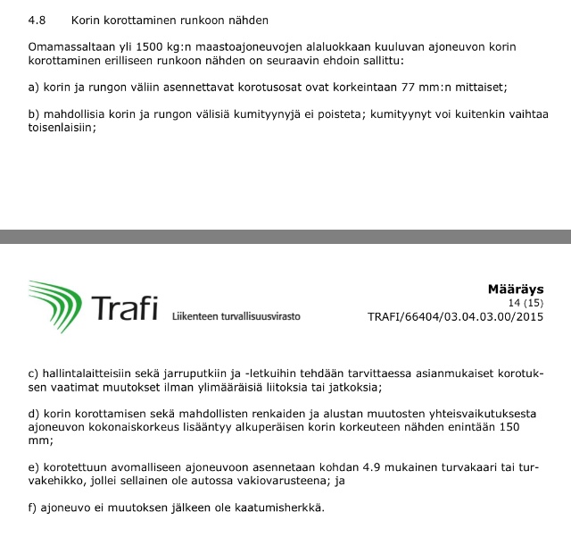 Kysyin häneltä myös, että jos olen asentanut korottavat osat itse, niin kai silloin riittää että kirjoitan itse katsastajalle lapun jossa lukee kuinka paljon auton korkeus on muuttunut. Siihen hän vastasi jotain sekavaa