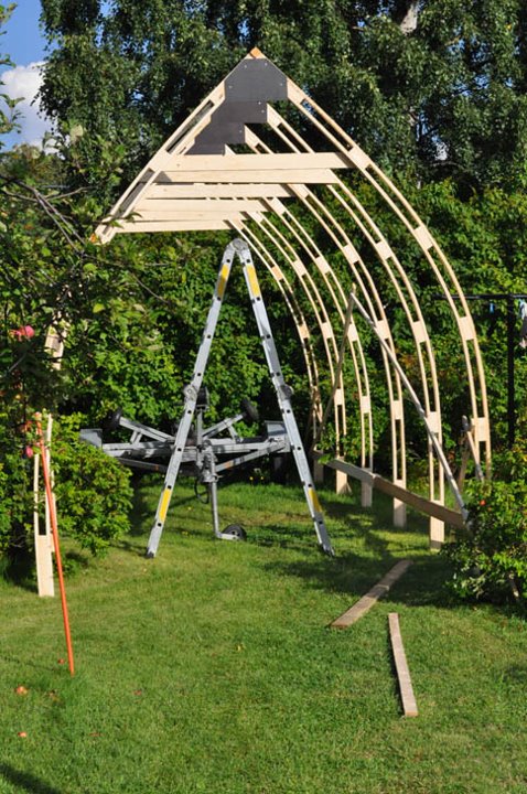 Tehkää kerralla tuollainen pressutalli. Ei tarvi huolehtia lumien pudottamisesta. Se aika joka menee normi kaarihallin katon tyhjennykseen talvenaikana, rakentaa tuollaisen teltan. Koko määräytyy sen mukaan kuinka pitkiä lautoja käyttää. Tähän malliin ei myöskään myrskytuuli helposti ota. Itsellä 5x8 katos, kustannuksia tuli 500e, kaikki tarvikkeet ostettuna