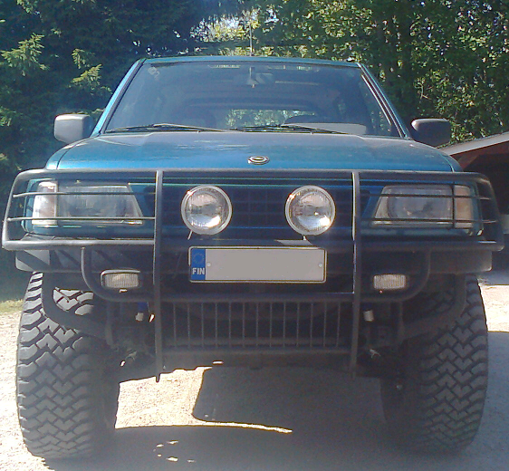 -92 Frontera "Antero"Kaipa tämäkin rysä jo oman projektikertomuksensa ansaitsisi. Autohan on Opel Frontera 1992 2.0 lyhyt malli, eli Sport. Maastureista jo nappulasta saakka haaveilleena, tilanne kulminoitui muutama vuosi sitten niin pahaksi, että oma laite oli saatava. Asiaa sen enempää tutkimatta, löysin nettiautosta halvalla tämän yksilön ja se oli saatava. Isän kanssa lähdettii ko. kikkaraa katsomaan Lahteen ja mukaan se sieltä tarttui. Offipalstaa olin jo lueskellu useammat vuodet ja heti hankintakesänä piti alle saada korinkorotus ja palkkihelmat. Palkkihelmoihin hain 80x120x4 palkkia tarpeeksi, rälläköin vanhat helmat mäkeen ja uudet tilalle, ainakin käytännössä, onneksi aika kultaa muistot. Gegguli86:lta tilasin 65mm korinkorotuspalikat ja kesälomalla ne piti laittaa alle. Netistä luin vielä et homma on ihan Bolt-on, niinku kaikki aina. No koko neljä viikkoa hurahti siihen. Pisin aika meni sopivia pultteja tilaillessa ja niitä odotellessa, jäähdyttimelle tein uudet kiinnikkeet ja vaihdekepin aukkoa piti suurennella, korkanneita kierteitä piti korjailla yms. pientä. Tämän projektin jälkeen vannoin, etten vastaavaan ala enää koskaan. Seuraavaksi ostin uudet vanteet 15"x8" -20et:llä ja niille palstalta 33x12,5 Hankook dynaprot. Tällä setupilla ajeltiin seuraavaan kesään, jolloin taakse laitettiin ainakin pidemmät riiput ja ties mitä. Korkeammalle piti kuitenkin päästä, joten alkoi nettimetsästys korotusjousisarjalle, joka löytyikin Calminilta. 3" korottava setti tilattiin Maastoautotarvikkeen kautta kotiovelle ja asennukset piti taas netin mukaan olla bolt-on, no sen vuoden kesäloma hujahti sitä laittaessa ja lomarahat paloi siihen. Setissä tuli lisälehtiä taakse ja eteen uudet vääntösauvat, kaikki iskarit ja pitkät riiput, sekä ylätukivarret. Asennuksen jälkeen pyöränkulmat olivat perseellään ja auto kuin kivireki, ei tietoja joustoista. Etupäähän piti tehdä säätölevyt, että kulmat sai järkeviksi ja etupäätä piti pudottaa hiukan alaspäin, että vetonivelten kulmat eivät olisi niin hurjat. Leimalla inssi sanoi että renkaiden kulutuspinta tulee ulos kaarista, asialle tarvii tehdä jotain. Maastoautotarvikkeesta tilasin levikekumia ja laitoin paikalleen, tämän jälkeen -20et vanteet jättivät renkaat liian syvälle kaareen, joten tilaukseen lähti 10" leveät -44 et:llä. Hetken kestin jyrryyttää autolla, jonka jälkeen päähän pesiytyi ajatus SOA:sta, jotta alustasta saisi pehmeämmän ja aikansa päässä muhittuaan, ajatus muuttui toteutukseksi. Sen enempää soa-ohjeita lukematta aloin töihin. Pakoille uudet pedit akselin yläpuolelle ja Calminin sarjan lisäjouset pois välistä, uudet kiinnikkeet iskareille, niin etteivät vastusta joustoja. No kardaanihan siinä jäi hiukan liian lyhyeksi ja taitaa maksimijoustoissa tulla aika huulille, jossain kohtaa pitäisi paneutua sen laittamiseen. Manuaaliset napalukot tilasin Summitilta ja kerrankin olivat oikeasti bolt-on. Vuodenvaihteen jälkeen tilasin MakeO:lta vinssin keulalle ja sille on nyt viimeiset viikot tehty pesää puskurin taakse. 1. kuva: palkkihelmat ja korinkorotus. 2. ja 3. kuva: Calminin korotussarja paikallaan. 4. kuva: SOA tekeillä ja remonttipaikka jossa taivas kattona. 5. kuva: SOA tehtynä, työpaikan pihalla, verrokkina lyhyt Pajero. Seuraavaan postiin lisää vinssin laitosta, tämä paremmin dokumentoituna, kiitos uuden puhelimen, jossa parempi kamera.
