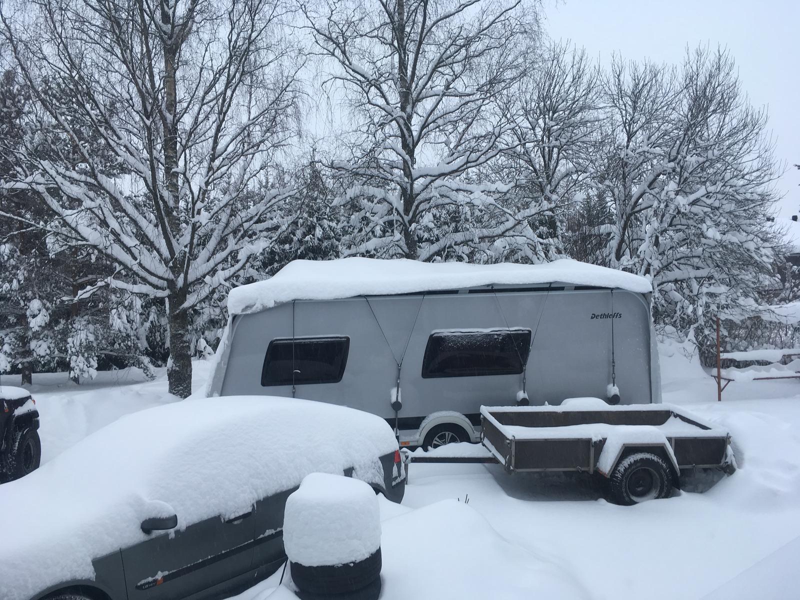 Vaunun telttakatos. Valmistajan (kuopiolainen) mukaan kestää 30-40 cm lumikuorman, käytännössä ei n. 20 cm:iä höttöstä. Onkohan nyt yhtä vaille joka ikinen talvi tullut alas; ekaks oli lasikuitukepit - katkes, sit alumiiniset - väänty, nyt esitaivutetut alumiiniset - ja taas mutkalla.