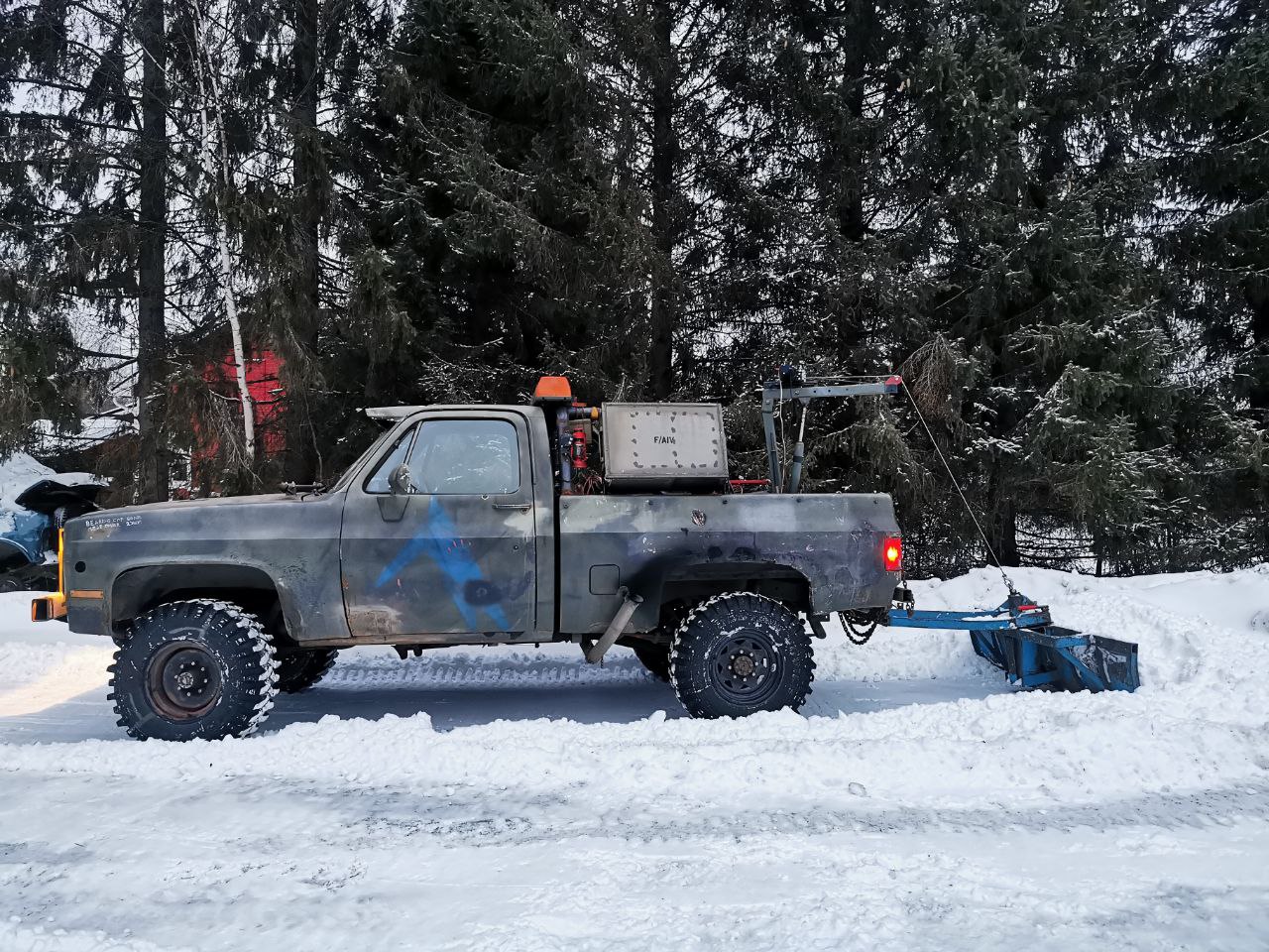 Nostosylinterin joutu tilaamaan pitemmän ja se kun tulee teen sille kiinnikkeet ja samalla tuon puskurin tilalle semmonen missä ei vinssille ole paikkaa vaan hydraulikoneikko tulee siihen.