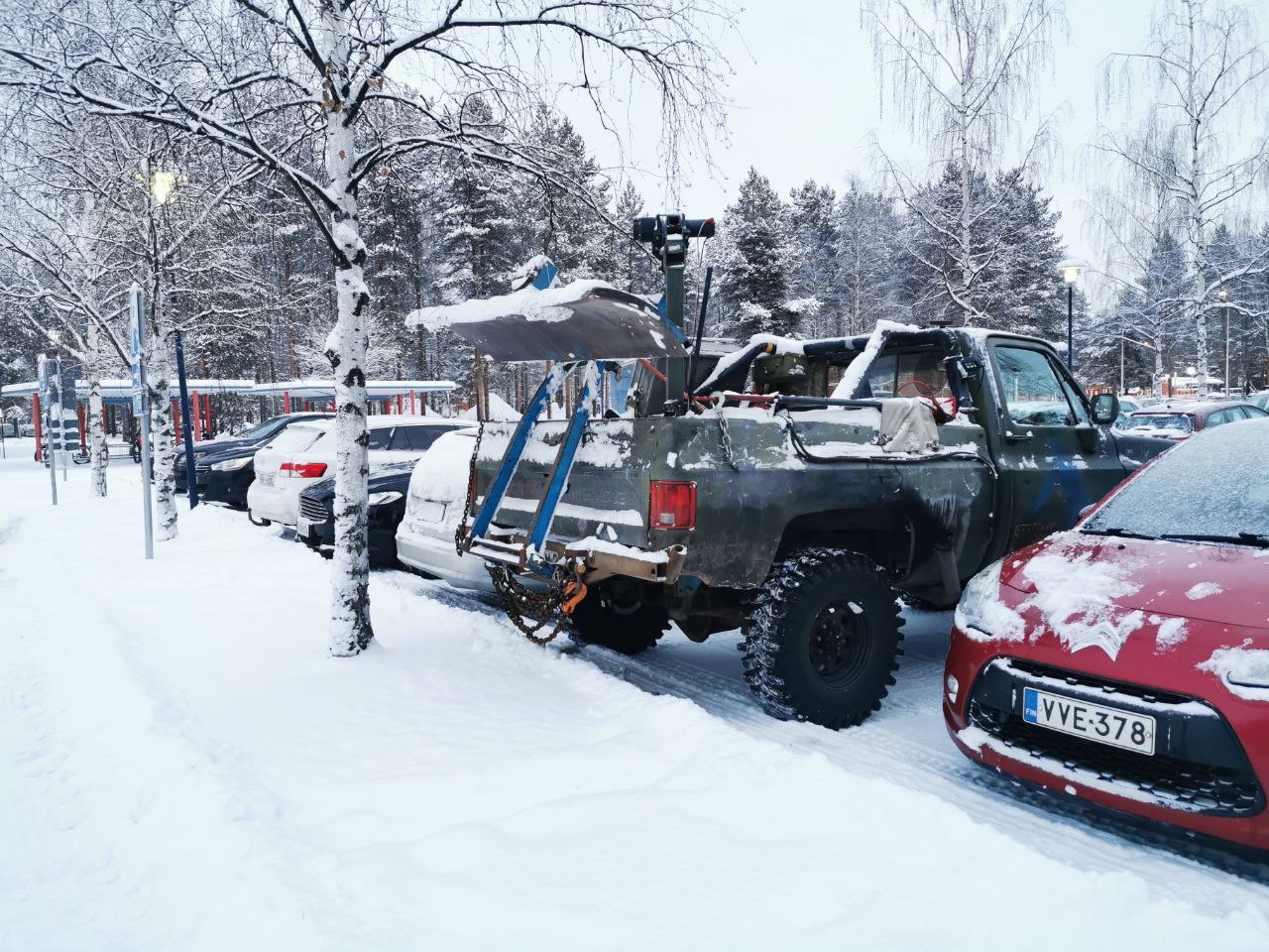 Mökkiaurasta otin vähän ideaa ja tein oman version. Hintaa tälle tuli 0 euroa. Vetoaisan lainasin maastoperäkärrystä, romukasasta lankkua, vaneria ja kulmarautaa. Lavalle tripodi ja siihen vanha puhelin kiinni josta kuva langattomasti hytissä olevalle läppärille. Takatyövalot on odottanu johdotusta jo pari vuotta, niin laitoin magneetilla olevan otsalampun työvaloksi. Aurattavaa ei ole kuin n. 80m pihatie ja vähän tallin edustaa pyyhkiä, yllättävän hyvin toimi. Pitää vielä vahvistaa rakennetta ja peruutuskamera on jo pitemmän aikaa ollu harkintalistalla niin nythän sille ois lisätarvetta.