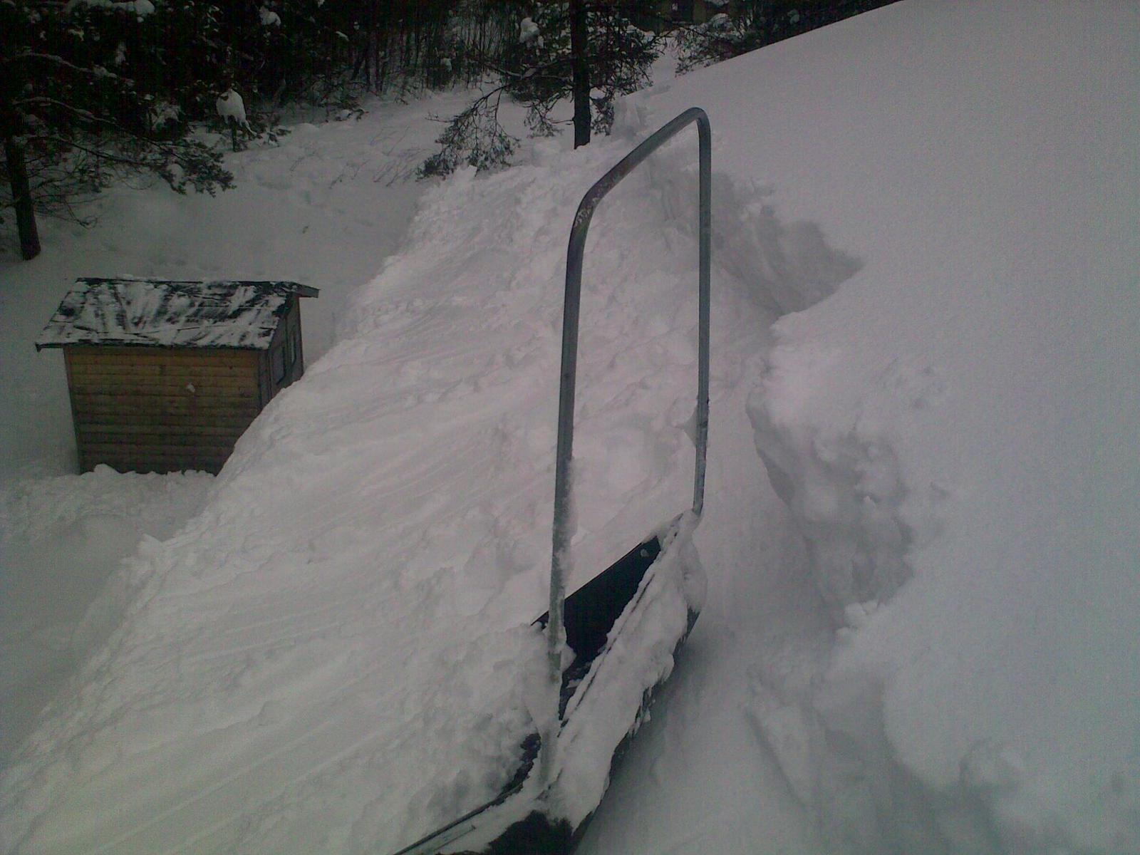 Ja tästä maistuikin kuva mieleen edelliseltä lumitalvelta kun reitin varrella on tönö josta kuisti pyörähti kokonaan naamalleen lumen painosta.
