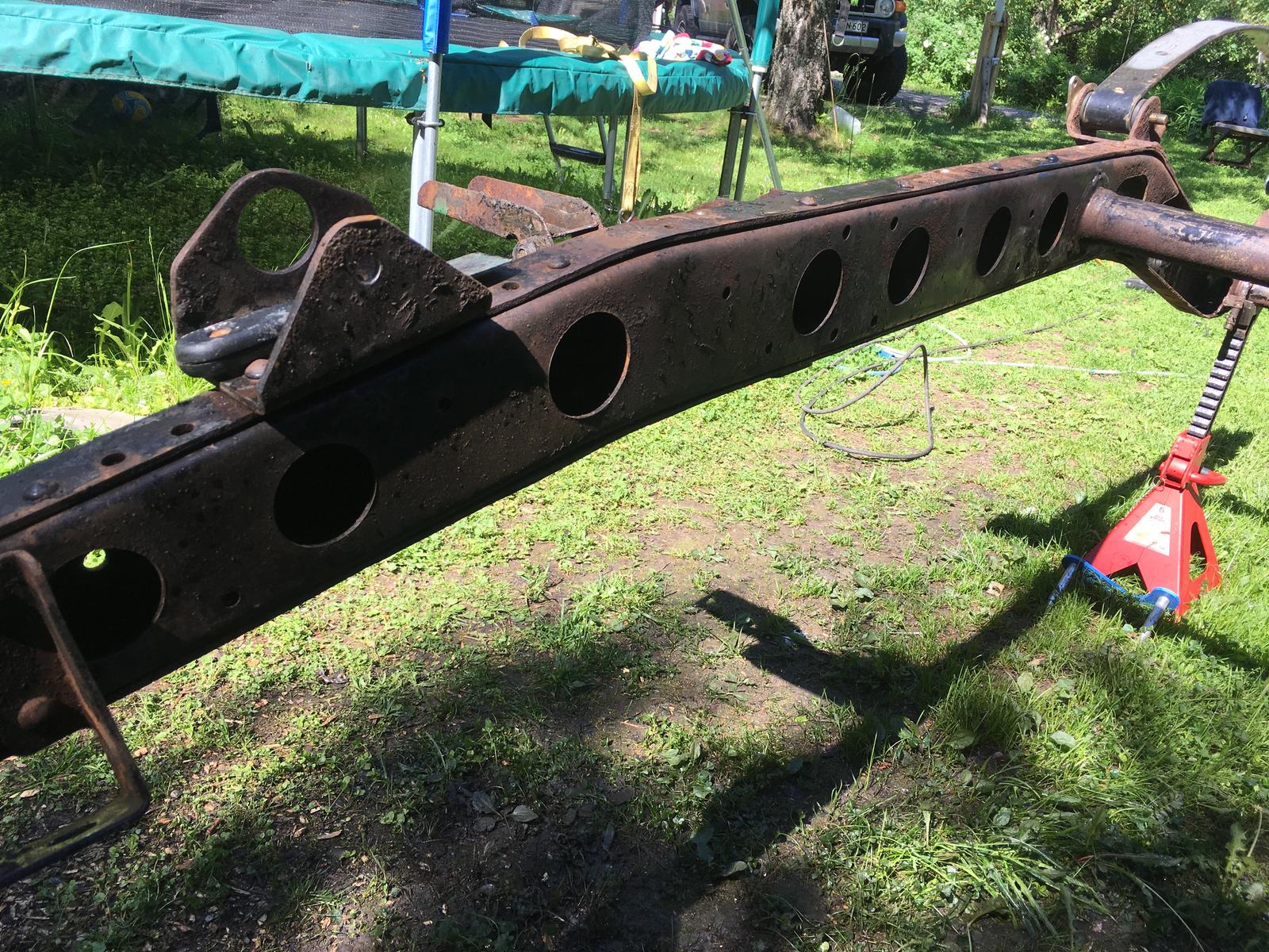 Tukirauta iskarinpulteille, alaosassa noin kahden millin rako: Muistaakseni tuosta edellisen kuvan vasemman takaiskarin kiinnikkeen etupuolelle tämä palkin sisäkuva: Tulppaa kaikki rungon reijät ja täytä runko jarrunesteellä? Luulisi maalin irtoavan. Ensin vain laskee vettä läpi niin kauan ettei tule hietaa ulos.
