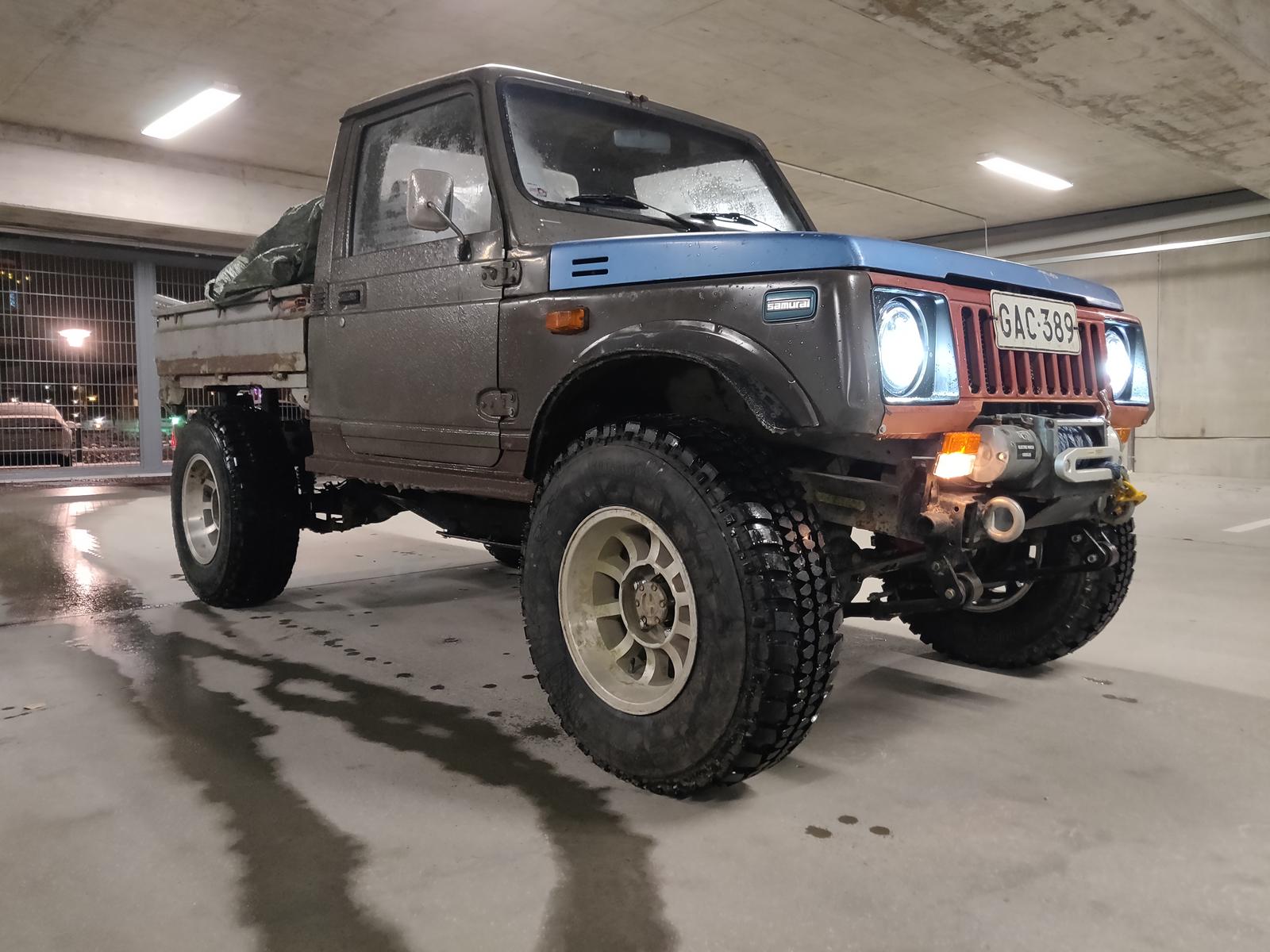 Pick-Up SuzukiKeväällä tuli yksi haaveista täytettyä, kun hain itselleni K-sarjalaisen Suzukin. Autolla on sikäli kiinnostava historia, että siihen on jokus 90-luvun alkupuolella muutosteltu Samurain tekniikka kokonaisuudessaan ja tämähän tekee siitä mainion lähtökohdan seikkailuauton rakentelulle. Siitä on jo se melkein kymmenen vuotta, kun ensimmäisen kerran iskin silmäni tähän nimenomaiseen yksilöön, ei vain silloin ollut mahdollisuutta ostaa pois. Nyt vajaa 10v myöhemmin sattuipa asia puheeksi Suzuki Safarilla LaaLaan kanssa, jolle auto oli vuosien varrella palautunut. Safarin jälkeen kävin vielä katsomassa autoa ennen ostopäätöksen tekemistä ja paiskattiin kättä päälle. Hieman on ulkonäkö muuttunut vuosien varrella ja varmaan tulee muuttumaan vielä enemmän tulevina vuosina Alla alkuperäinen myyntikuva vuodelta 2011Kaikenlaista pientä autoon on ilmestynyt. Ostohetkellä jakolaatikossa oli välitykset (taitaa olla 6.5), pokspoks (LockRight) lukko taka-akselilla, OME:n lehdet ja Raptorin iskarit, Opelin tehostin, Tankilla ja jakolaatikolla panssari, palkkihelmat sekä vinssi keulalla. Renkaita en ostanut mukaan, sillä mulla oli varastossa 33" MudTerrainit tätä varten jo aikaisemmin hankittuna. Vikalistaa leimaa ajatelellen on ainakin seuraavasti: -Taka- ja etujarrut herkistely/putsaus/uusiminen -Takavaloissa on joku mystinen kontaktihäirö -Takana toisen rekisterikilven valon kuuppa puuttuu -Toyotan? kaasarin säätö -Konepellin lukko puuttuu -Taustapeili -Äänimerkki Muuta korjattavaa/parannettavaa: -Startti kliksuttaa -kesäakku pitää vaihtaa kunnolliseen -Kytkin on vaihtokunnossa -jakolaatikon tuenta (nyt POM-kangesta pötköt, joista kaikki eri mittaisia ja yksi jopa kahdesta palasta) -Jarruletkut lyhyenlaiset, vaihto ja kiinnikkeiden parantelu -Etukardaanssa liuku väljä ja ristikot vaihtokunnosa -Takakardaanissa liuku väljä ja akselin puolen laipassa ristikon pesät väljät -410 jäähdyttimen vaihto -Lämppärijärjestelmän toimintakuntoon saattaminen -Ohjauspylvään sähköt vedetty sokeripaloilla ![]() -Alumiinilavan korvaaminen alkuperäisellä lavalla -Sisustan siistiminen (nyt on epämääräisiä reikiä melkein jokaisella pinnalla) (Maasto)varustelua -Perien panssarointi -Stereot ja subbari -LA puhelin -Kompura/onboard air -Etulukko sekä Raptor HD tikut ja murrokset -Jytkympi laturi -Paremmat penkit -Ruisku -Remmiahdin? -Kaatokaaret -Valoja!