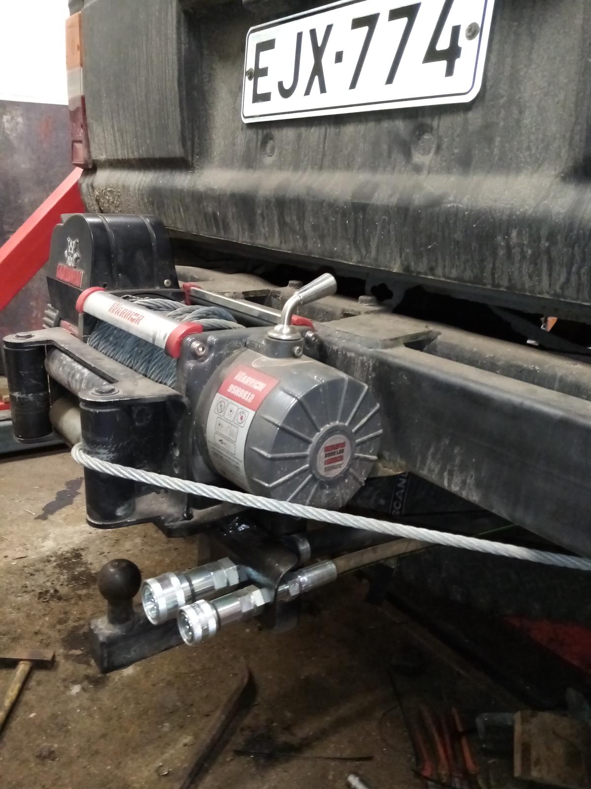 Vinssin asennusta. Autoon tulee hydrauliikka myös lumiauralle ja taakse meno ja paluu nosturiperävaunulle. Siitä projektista myöhemmin. Ulosottoon tulee hammaspyöräpumppu. Tietääkö joku voimanoton virallista tehonkestoa?