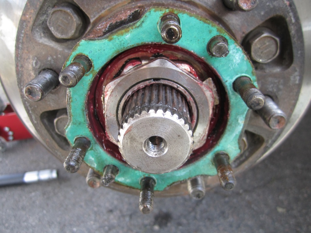 Keskikuppi irti ja 6kpl pienet mutterit auki, pari kertaa vasaralla kopan kylkeen ja kiilat irtosivat. Koppa pois, ison mutterin lukkohakaset auki. Iso keskimutteri olikin "auki" eli käsin avattavissa, samoin sisempi (!?). Liekö jäänyt löysälle tai löystynyt matkalla. Punaista vaseliinia käytetty ed. rempassa. 30v vanha j-kilpi pois ja uusi tilalle. Pah, j-sylinteri ei mahdu paikoilleen. Rälläkällä peltiä pois kolmesta kohtaa (merkattu piikillä) ja sit sopi. Aikaa meni 2h eka puoli ja toinen 1h, kun siinä välillä sauhutteli, rällköi, mittasi ja haki työkaluja varastosta.