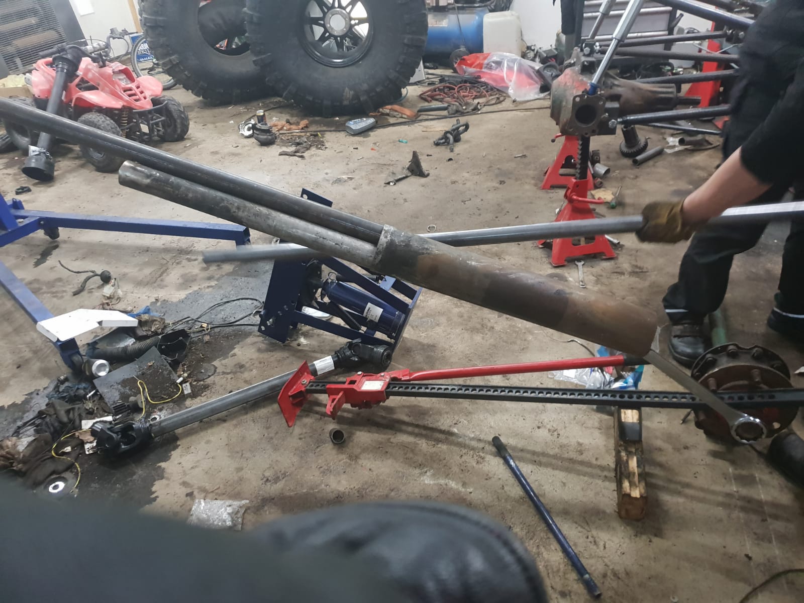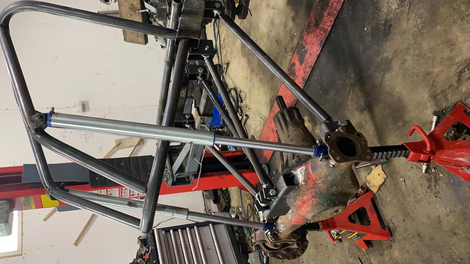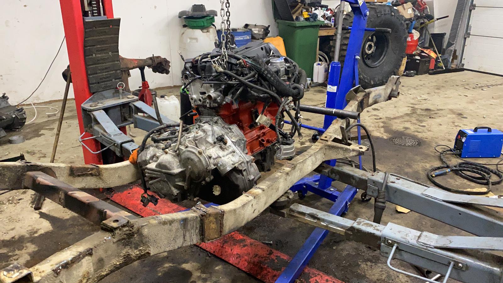 Suzuki sj 410Hirveä into iski ruveta suzukia parsimaan kasaan päin. Tuli raapastua tuommosesta hyvin pilatusta suzukista runko paljaaksi ja rungon painoksi jäi 34kg. Siihen sitten saabin b235r kone keskellä autoa automaattilaatikolla. Tässä vaiheessa kaikki oli helppoa mutta sitten aloin miettimään neli linkkejä ja kardaanin pituuksia ja olisihan se kiva jos akseliväli jäisi alle 3m. Näitä sitten hieroin tovin mutta kun ajatus sitten selkisi niin akselit löyti itsensä alle ja kardaanit saadaan järkevän mittaiseksi eli ensimmäinen varsinainen haaste selvitetty. Etuakselin kanssa oli vielä sellaista painia että runkoaisat piti lyhentää että pyörä mahtui kääntymään ja tämän takia joutuu tuon putki keulan tekemään. Taka-akselin putki oli silputtu joskus vuosien aikana ja porttaali boxin laipat oli leikattu irti. Niitä tulikin useampi tunti hierottua paikalleen. Akselit ostettiin silputtuna ja purettuna mutta kaikki osat on löytynyt. Pinjoniin joutuu tekemään stefat ja holkit niin pysyy turve ulkopuolella mutta se on vaan sorvia ja hitsiä. Seuraava haaste oli löytää istumapaikat tuolta korin sisäpuolelta. Saabin moottori tulee näppärästi juuri siihen missä olisi tarkoitus istua ja tuo 54" boggerikin haluaa melkolailla tilaa tuolta edestä että mahtuu kääntymään. Koria pystyi siirtämään noin 20cm eteenpäin niin nyt on jo toiveita että penkitkin mahtuu sisälle. Saabin koneesta irtoaa 270hv Automaattilaatikon välitykset on ihan jees. 1.vaihde 11,36 tasauspyörästö 2,44 Eli lyhyesti Saab 235r Saab automaatti Unimog perät Foxin 16" typpitikut Suzukin kori ja runko BMW e60 alumiini jarrut Bogger 54"