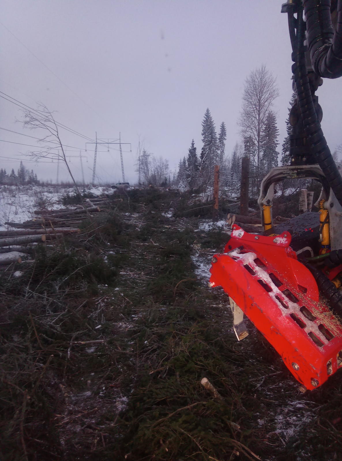 isoja kuusia rupes kaatuilee mökkien päälle ni nyt poistetaan rinteestä loputkin.