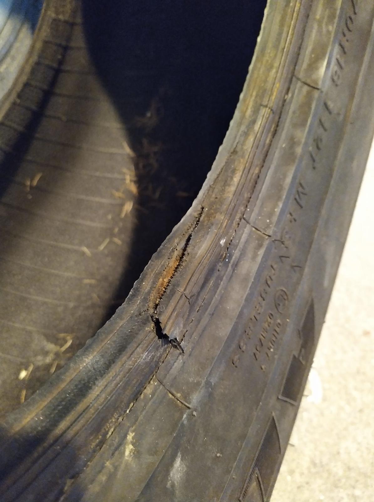 Eli edellisen omistajan toimesta tullut rengasta vanteelta irrotettaessa renkaan jalkaosaan kuvan mukainen viilto. Uskaltaako tuota rengasta vielä käyttää, jos tuon palkeenkielen liimailee kiinni ja laittaa sisärenkaan? Renkaan runko on ehjä.