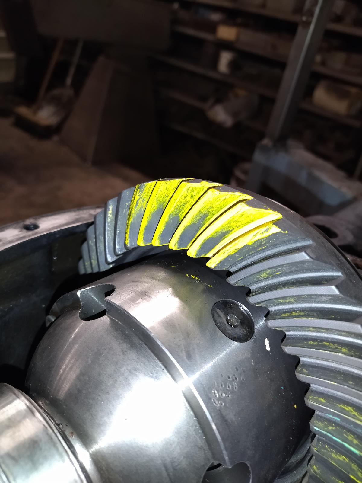 Hammaskosketus on vähän ylhäällä, kokeilisin paksumpaa shimmiä pinionin alle että miltä näyttää. Täydellistähän siitä ei aina saa, kunhan kosketus ei ole aivan laidassa, se on korkeussuunnassa suunnilleen keskellä ja hammasvälys oikea.