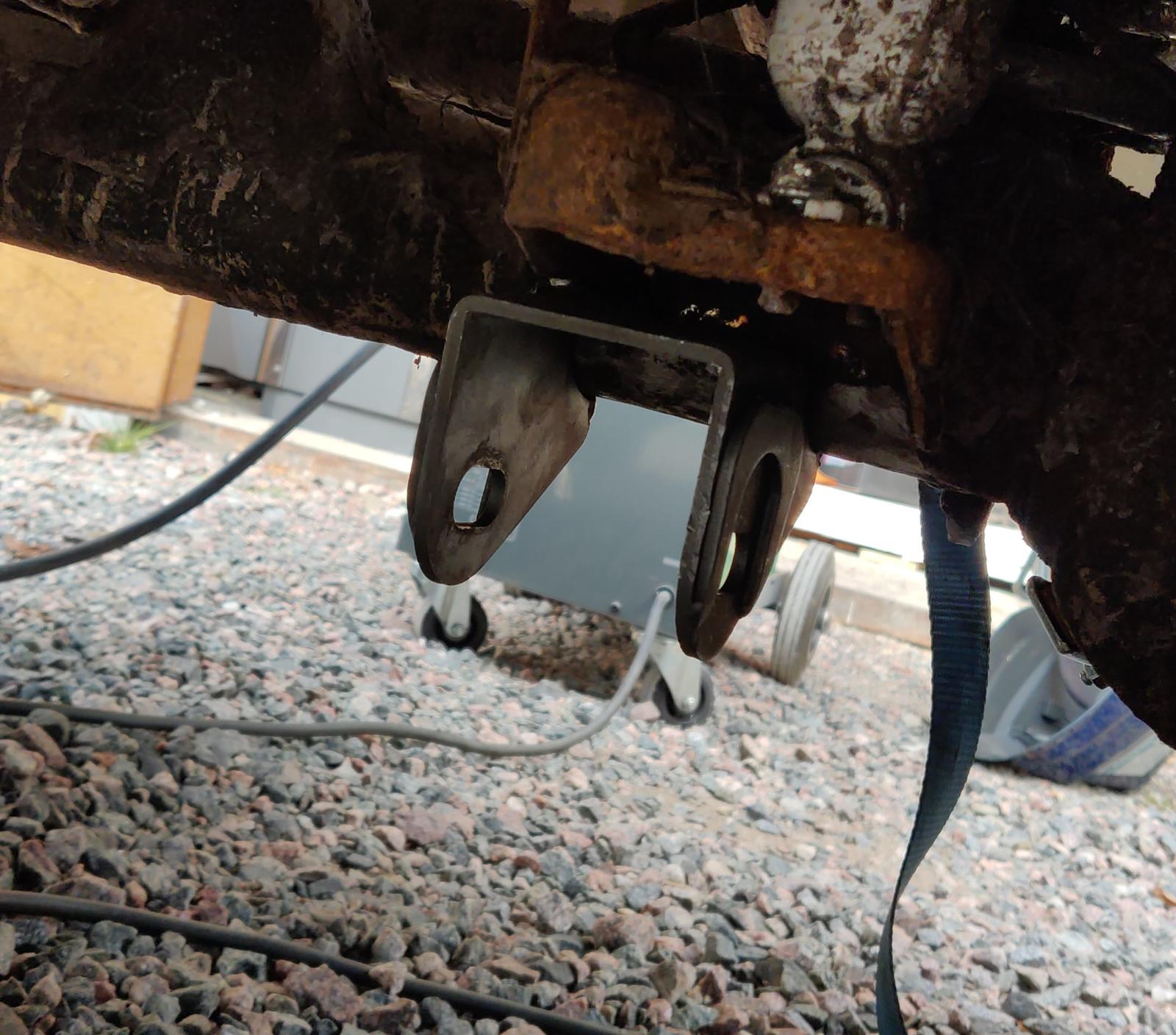 Korvakkeen hitsailin tossa paikalleen, joskus yritetty näköjään vahvistaa joskus. No jos tuo tämän syksyn vielä pysyisi paikoillaan, talvella tarkoitus tiputtaa akselit alas ja vahvistella. Samalla täytyy miettiä, että tukivarret tulisi uniball-nivelillä. Nämä uretaanipuslilla olevat repii korvakoita, kun eivät anna myöden yhtään.. Muutama kuva kans.