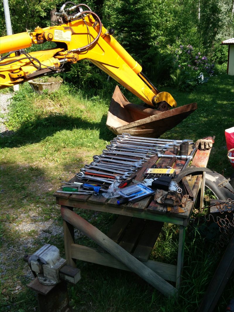Hellepäivän lisähommana perkasin koneen työkalut ja laittelin ne kyytiin. Aika paljon kertynyt/tarvitaan 24 - 50mm avaimia tämän remontissa.