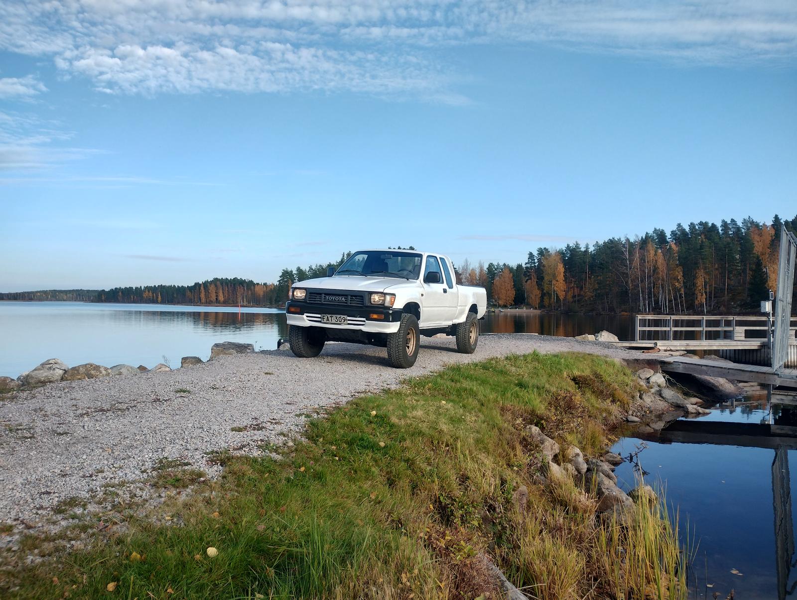 Sitten vois laittaa tommosesta käyttisprojektistakin tänne vähä juttua, vaikka ei offiautoa tästä tule. Maksimi rengaskoko tarkoitus pitää 31" eli kyseessä Hilux ln110 minkä ostin moottori vikaisena. Autossa hyviä puolia oli että runko on kova ja hitsaamaton, poikittaispalkkia joka kannattelee tankkia ja pakoputkea lukuunottamatta. Uusin palkin. Runko sai syyshuollon eli höyrypesu, happo ja joku 2k jäänmurtaja maali päälle. Lavaa ja kopin takakulmia piti hitsata. Moottori sotki öljyä jäähdytin nesteeseen, mutta ei huohottanut, vedot tosi hyvin tallella ja ei savuttanut. Öljynsuodattimen jalka oli todella öljyinen ja murjotun näköinen. Irroitin sen ja lauhduttimen kolo lohkossa oli tosi öljyinen. Vaihdoin käytetyn jalkaosan ja lauhduttimen. Vaikuttaisi että vika oli siinä. En ole vielä paljon kerennyt koeajamaan. Autoon on vaihdettu turbo moottori runnerista ja laitettu välijäähdytin ja vesijäähdytetty Kiinan turbo. Sitä epäilin eka, mutta testasin että turpossa ei nesteet sekoittuneet. Akku oli laitettu lavalle. Tein "takapenkin" koloon pesän kahdelle akulle. Leimaa on jouluun, niin täytyy yrittää laitella muuten kuntoon syksyn aikaan niin kerkiää kunnolla koeajamaan moottorin.