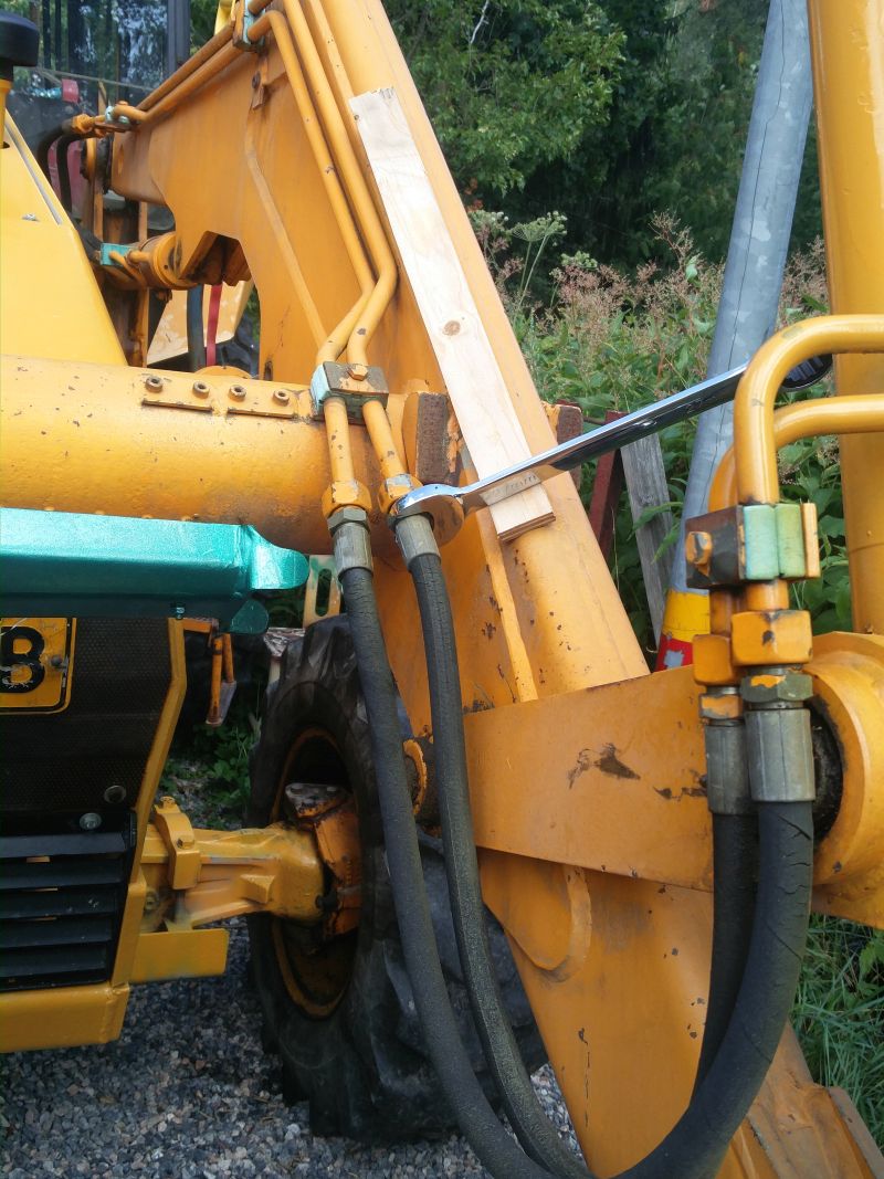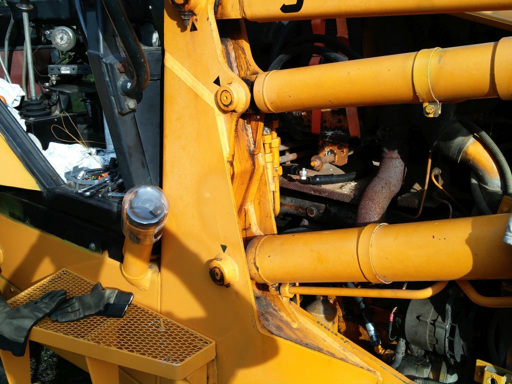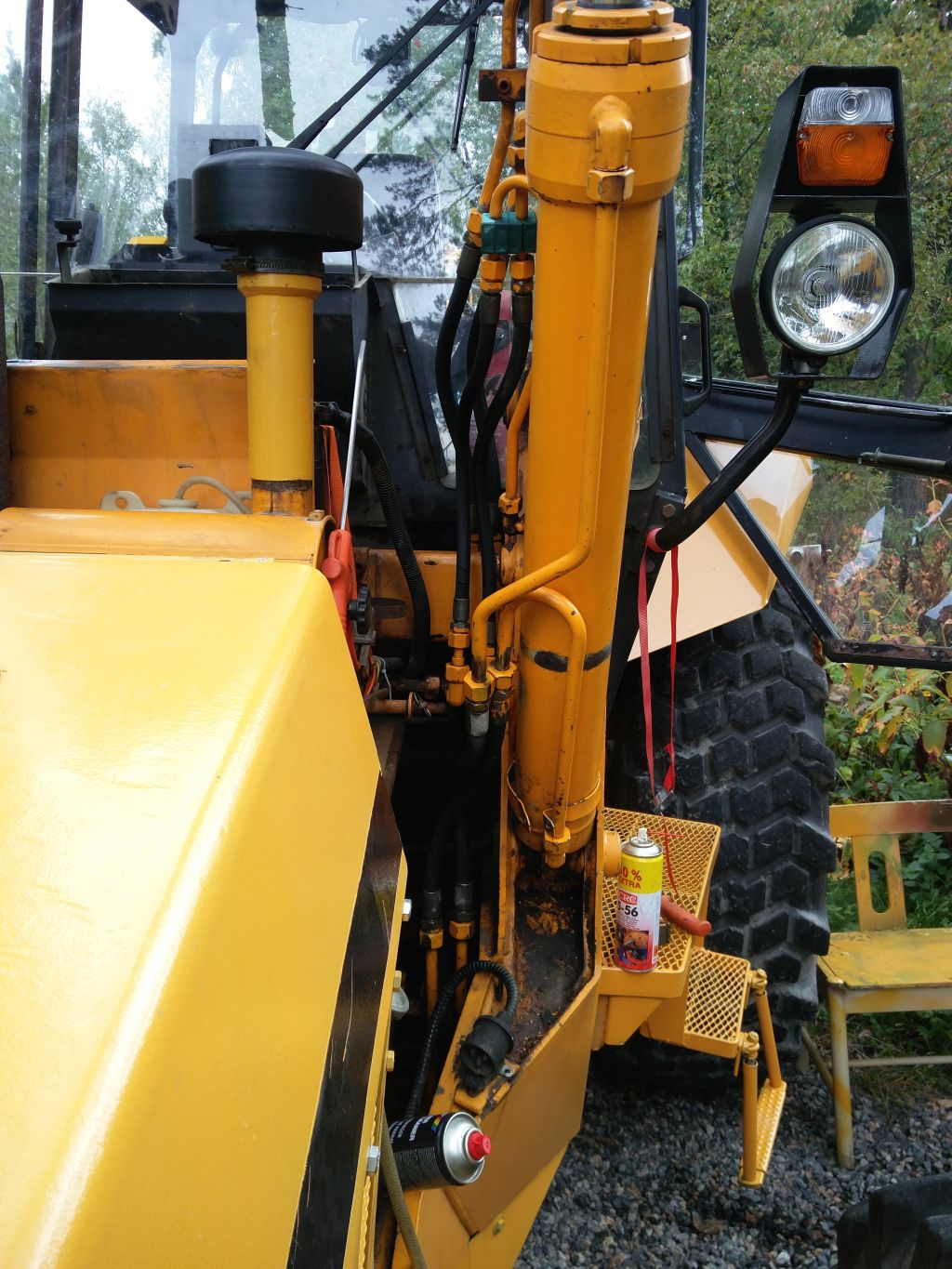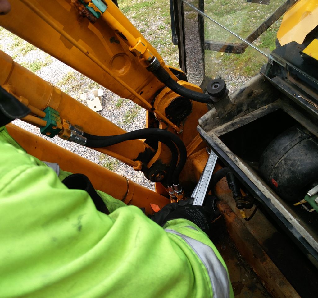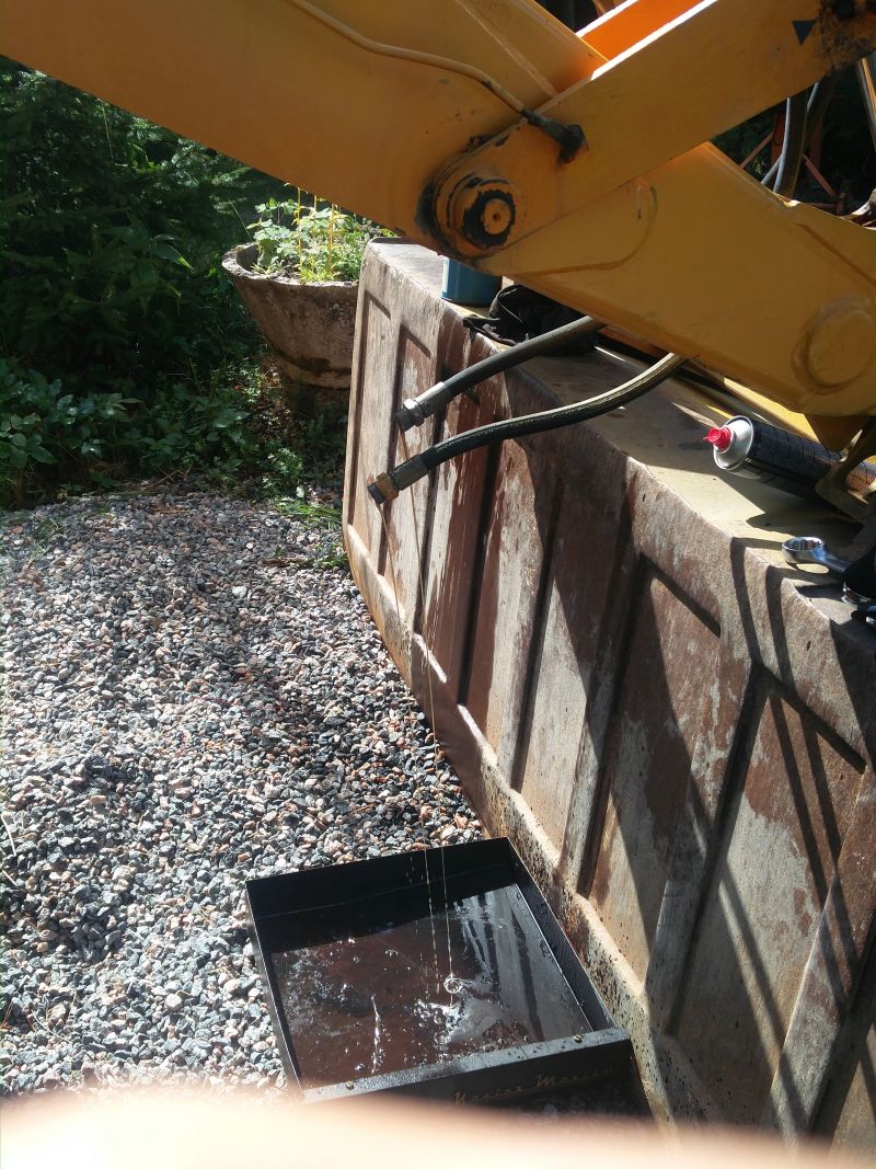 viimeksi jameksella työskentely jäi kesken pahan hydraliikka öljyvuodon vuoksi... Vuoto kohta löytyi ohjaamon alapuolelta lisähydrauliikan 6-tie venttilistä jonka ohjausvipu on kuljettajan penkin vieressä melkein alapuolella, josta ohjataan hydrauliikka kulmakaivuu laitteelle tai etukuormaajan lisähydrauliikalle. Olin epäillyt venttiilin vuotavan aijemmin vähäisesti, koska vaihdelaatikon päällä ohjaamon alla olevat syvennökset olivat öljyn peitossa muummoassa vaihteisto öljyn mittatikun ympärys oli öljyn peitossa ja james merkkasi paikkansa mihin jäi seisomaan. Venttiilin irroitus ei onnistunut kuin purkamalla ohjaamosta toiseltapuolen lattia auki... Valitettavasti penkin alapuolelta lattia ´´paneeli´´ ei irtoa, koska hitsattu ohjaamon rakenteisiin joten hauskuutta riitti kurotellessa venttiiliä sekä venttilin hydrauliputkia venttiilistä irti. Hydrauliputkia varten täytyi 30mm avolenkki avain lyhentää keskeltä poikki että pääsi hydrauliputket kääntämään venttilistä irti.