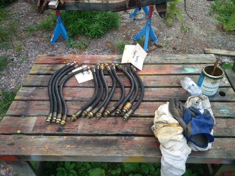 Nyt se sitten tapahtui. Sain remonttiin apumiehen ja malliletkut irti. Kolme letkua oli finaalissa. Toisin päin yllätys oli, että useampi alkuperäinen 86 vuosileimalla ollut Aeroequip letku oli ihan virheettömässä kunnossa.