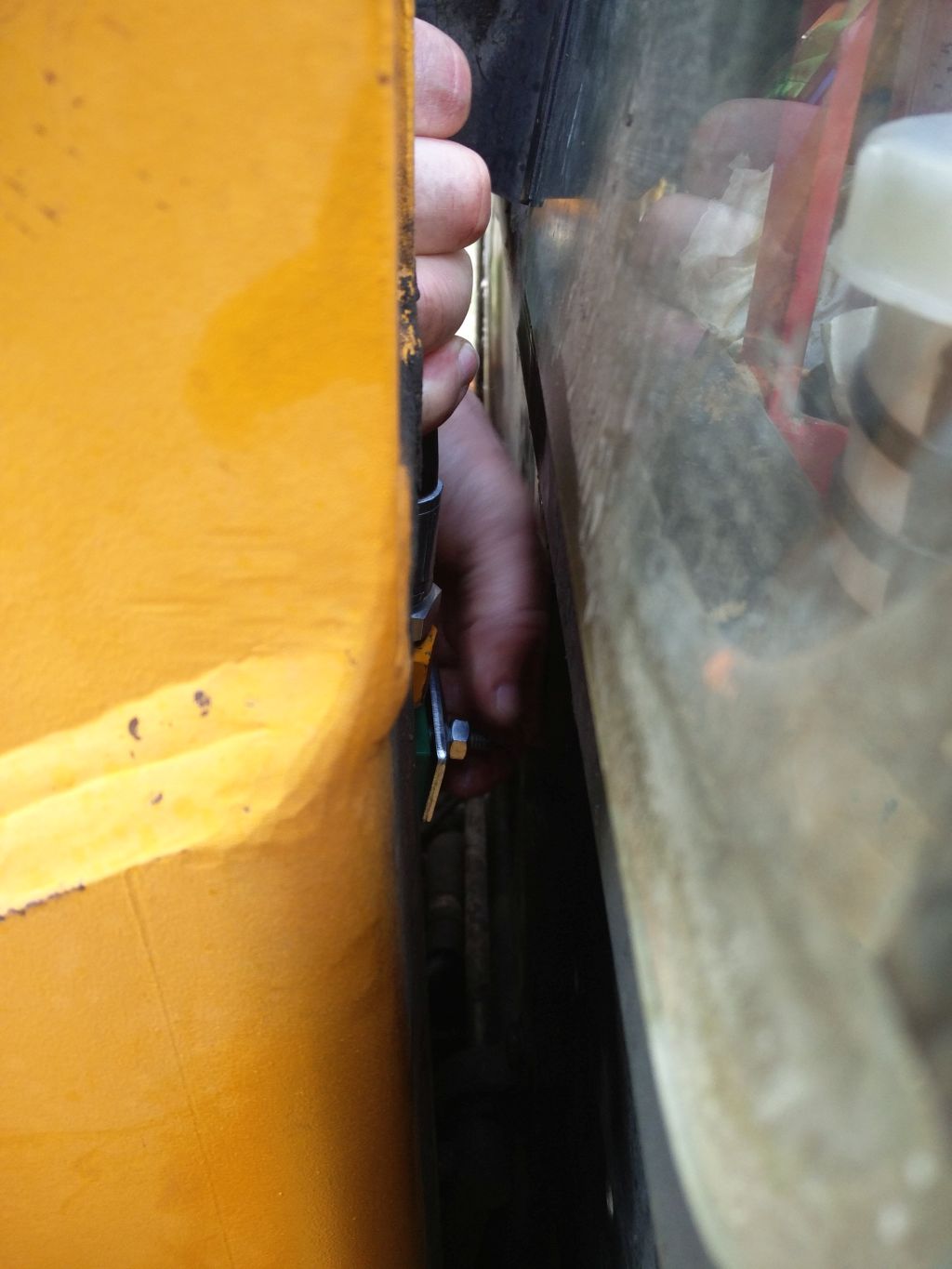 Tänää tuli mursketta tontille ja piti duunata vähän tietä. Pari kuuppaa meni hyvin sitten kone ei enää lähteny käyntiin. Kaikki sähköt hävis. Aavistus, että korjausta odottava päävirtakytkin lopullisesti kaput osoittautui oikeaksi. Perkins heräs kun tyrkkäs 46mm kiintoavaimen kytkimen napojen yli. Nyt ei auttanut enää muu kuin ryhtyä purkuyritykseen. Toistaiseksi ahtain aikka missä olen mitään ropannu. Hytistä pieni ikkuna irti niin pääsi jotenkin kytkimen muttereihin käsiksi. Kyllä se sieltä lopulta irtos.