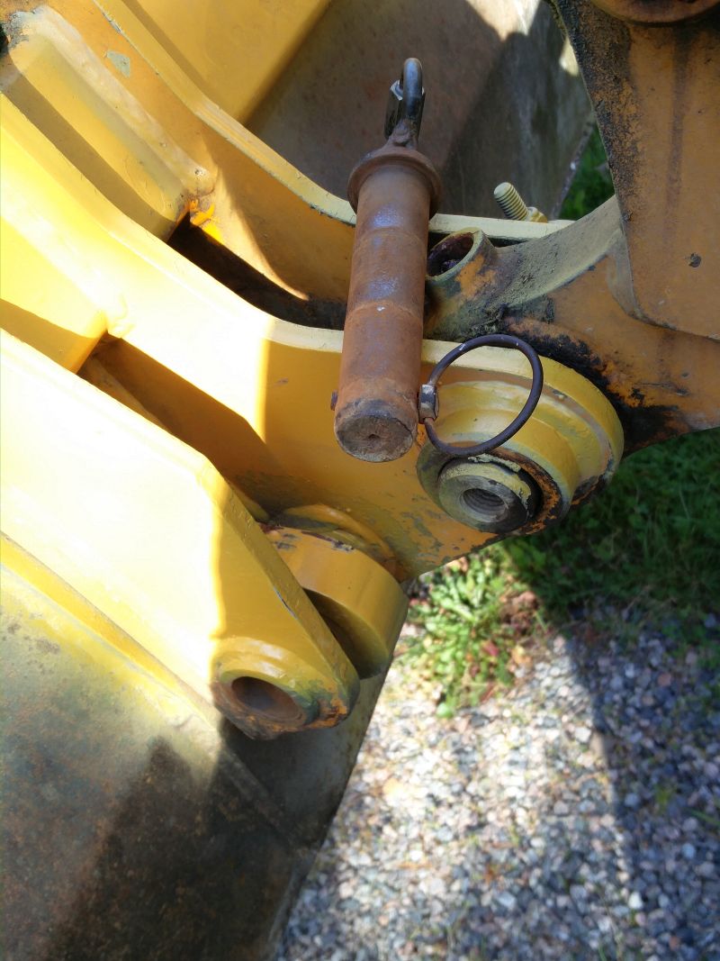 Letkuremontin jälkeen sain etukauhan paikoilleen. En tiedä mitä koneelle on joskus tapahtunut, mutta näyttäisi siltä, että vasemman tapin kolo on jotenkin levinnyt. Ei ole ihan ohutta kamaa tuossa kohdassa. Oliskohan toinen puoli irronnut ja kauha retkahtanut yhden tapin varaan. Homma ratkaistu katkaisemalla sokka jotta menee edes jotenkin paikoilleen. Tuo kun ei taivu millään järjellisillä keinoilla niin hioin otsapinnasta pari milliä pois niin mahtui ehjä sokka paikoilleen. Tossa on kyllä odottava tappiremontti. Tappi 30mm ja reikä noin 33,5mm. Etukauhan puomin ylätapeissa on myös useampi (8..10mm) milli mäljää. Onneksi ei tuossa kohdassa kauheasti haittaa.
