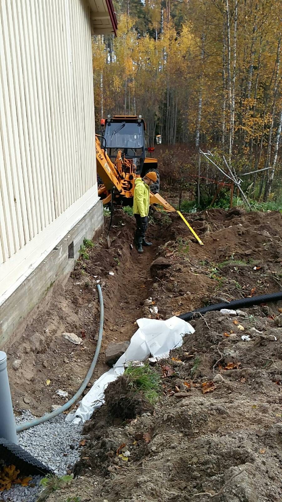 Sanonta kaivamaan oppii kaivamalla lienee oikea. Pikkuhiljaa alkaa tulla tuntumaa ojankaivuuseen. Lisäyksenä edelliseen varomaan oppii kaivamalla salaojaa rakennuksen viereen. Räystäät vielä ehjät eikä kauhankuvia seinässä.