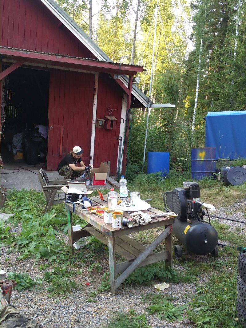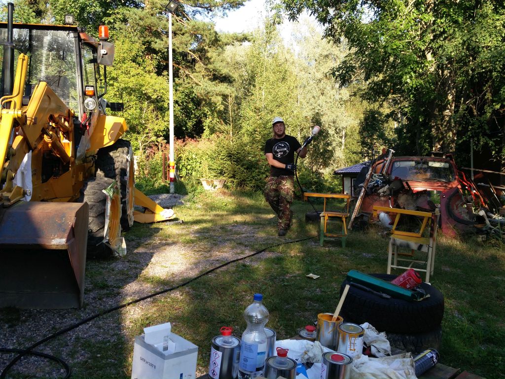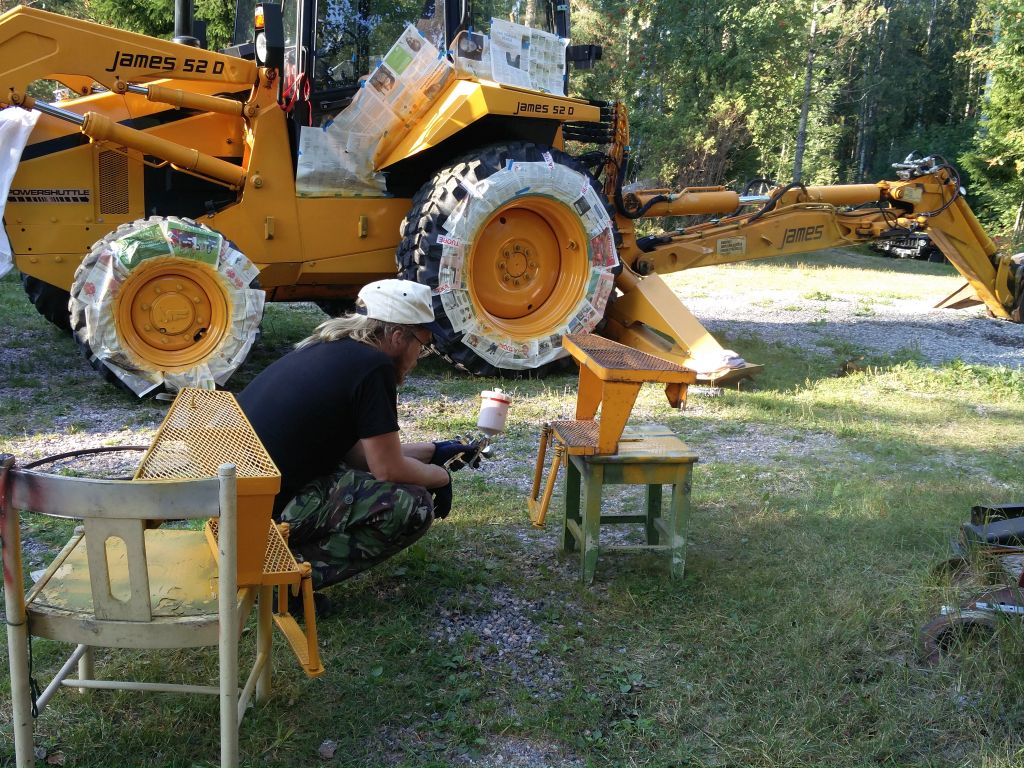 Kävin hakemassa IKH:sta Caterpillar keltaista kun olen päättänyt, että kone muuttuu hissukseen tähän väriin. Vahinko vaan, että hyllyssä oli vaan yksi litran purkki. Aloitettiin pyöristä. Sitten rappuset ja lokasuojiin ym paikkoihin pieniä paikkauksia niin pitkälle kun maalia riitti. Koneen ilme kirkastui taas hieman. Ruiskumestari oli tyytyväinen hankintaansa. En tiedä kummalla oli enempi vaikutusta. Maalin reippaammalla ohentamisella vai paremmalla ruiskulla. Nyt jälki oli priimaa. |