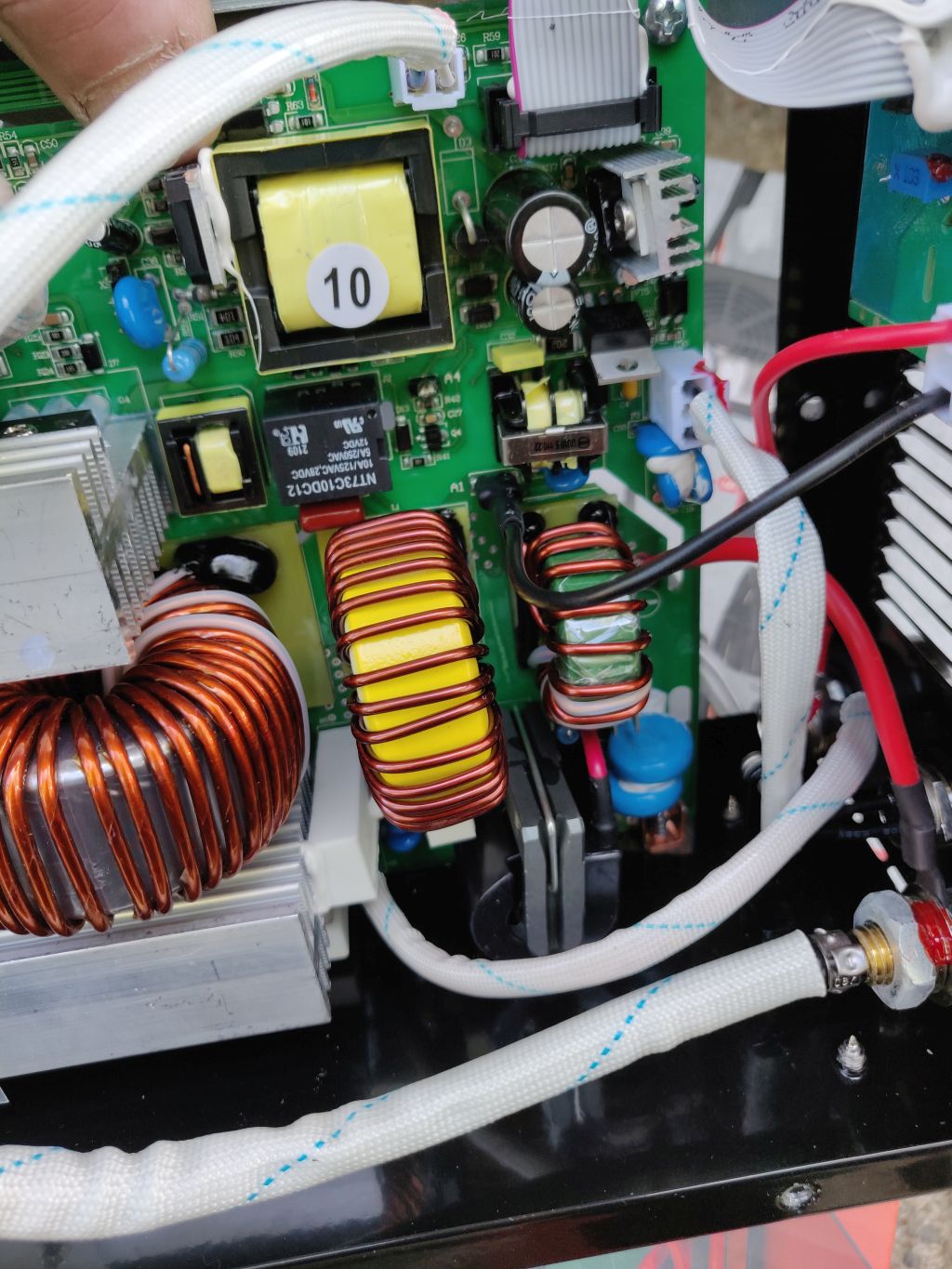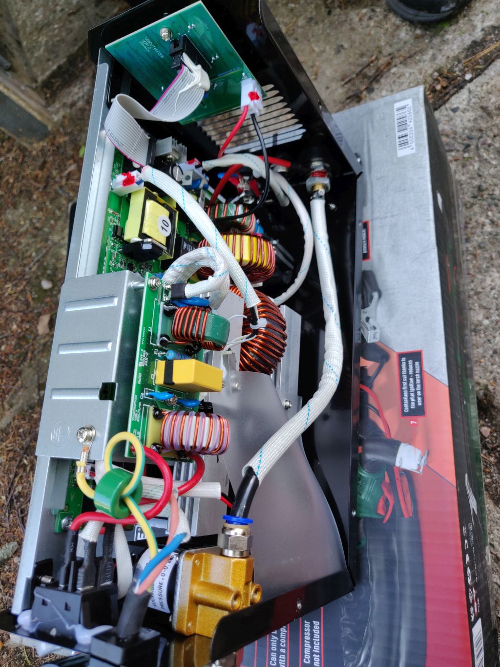 Muuntajia on pirusti. Ei tullu tarkkaan tutkittua, mutta pääpiiri näyttäisi olevan 1/2 silta. Päämuuntaja tehty isolle toroidi sydämmelle.
