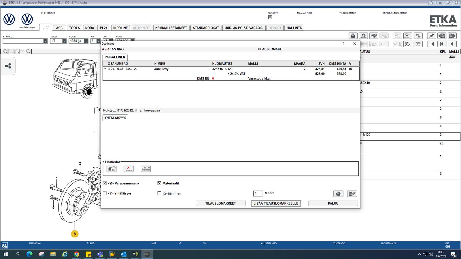Vw LT 45 4x4 1987 etujarrulevy, uusia ei enää löydy, teettäminen?Moi! Harraste autona on Vw LT 45, neliveto ja armeijan entinen. Katsastuksessa tuli nyt eka kerran hylsy kun vasen etu jarrulevy ilmeisesti kiero. Uusia ei enää löydy (numero 291 615 301A antaa netistä liian pientä, ilmeisesti takavedon) 4.7.2022 nyt Raskoneelle Kuopioon varattu aika jos sitten vaikka sorvaamalla saisi oikaistu. Kysymys on että onko joku muu taistellut vastaavan pulman kanssa, jos oikein tiukille vetää niin pystyykö uuden levyn teettämään jossain? Ja jos jollain löytyy käytettyäkin myytäväksi niin mielelläni ostan. Ja noudan, ei tarvitse lähettää. Kiitos etukäteen avusta!