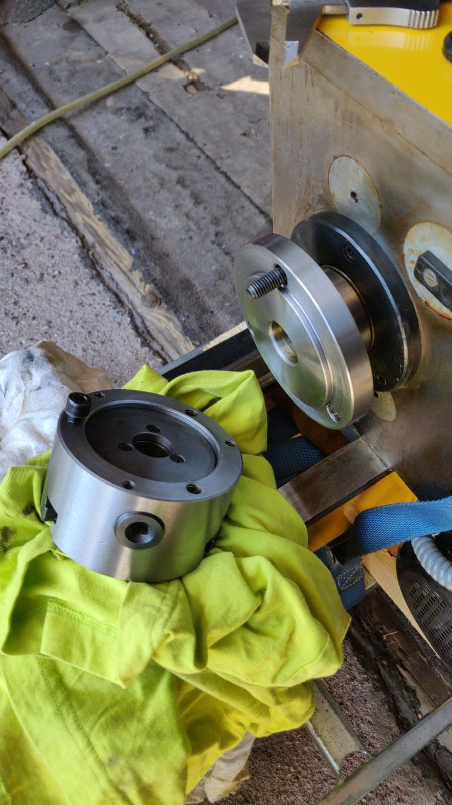 Ensimmäisiä huomioita kun kone oli saatu ulos Persveivarin kontista. Pakka oli väännetty väkisin "lintaan" kiinni. Karalaipan olkapää ottanut vähän hittiä. Raakasti viilalla pikahuoltoa ja ensimmäinen lastu kokeeksi. Kaikki tuntui toimivan, mutta vaihdeloota piti julmaa rallatusta.
