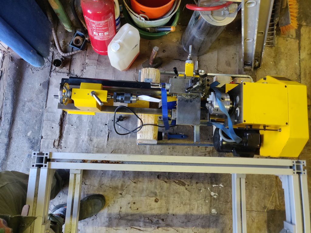 Ensimmäisiä huomioita kun kone oli saatu ulos Persveivarin kontista. Pakka oli väännetty väkisin "lintaan" kiinni. Karalaipan olkapää ottanut vähän hittiä. Raakasti viilalla pikahuoltoa ja ensimmäinen lastu kokeeksi. Kaikki tuntui toimivan, mutta vaihdeloota piti julmaa rallatusta.
