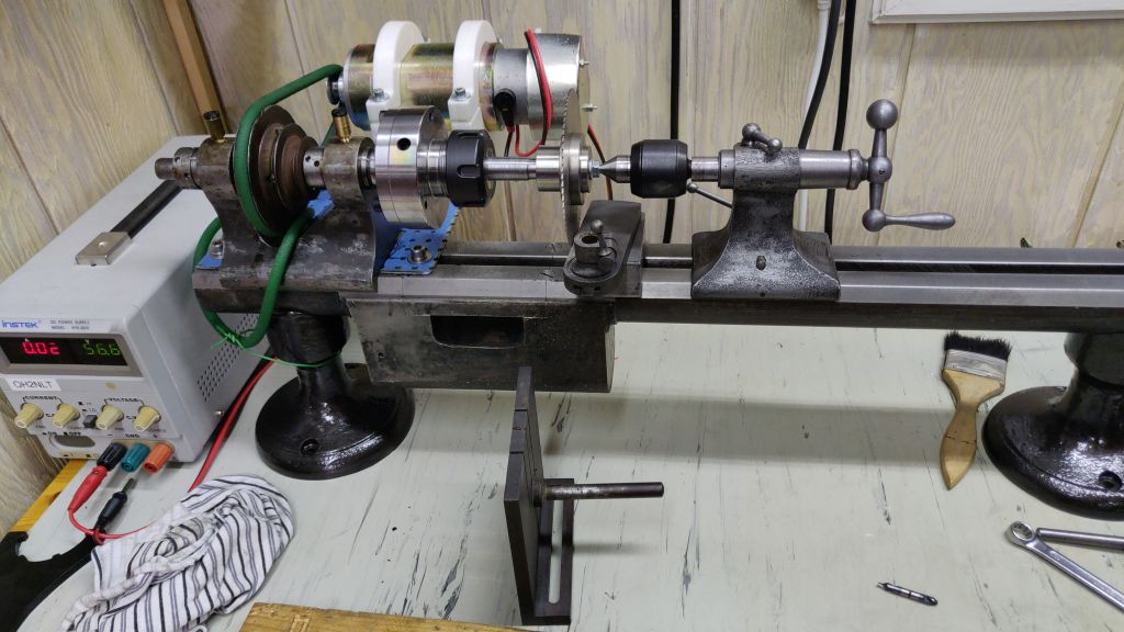 Moottoriratkaisua funtsaillessa ei tuntunut houkuttelevalta ruveta sovittelemaan koneen mukana tullutta VEM mosaa tähän. Muisti on kummallinen. Muistin, että luokkaa 40v sitten tullut otettua talteen Diablo 630 kiekkokirjoittimen kelkan moottori. Tuollainen pienen starttimoottorin kokoinen DC servo. Tarkkaa speksiä ei löytynyt, mutta alkuperäisessä käytössä jännite ollut 40V. 3D tulostimella pukit ja väliaikaisesti pellinpalaan kiinni niin pääsee koeajamaan. Kiinan siivapyörät tai aihiot oli vielä matkalla. Hermo petti niin piti tehdä ensimmäinen pitkästä. Alunperin veto ollut todennäköisesti pyöreällä nahkaremmillä. Pyöreetä PU remmiä saa metritavarana. Tässä suuri etu on, että karapylkkää ei tarvitse purkaa vaan remmin voi hitsata in situ. Hitsauslaite syntyi kun ison kolvin vastuksen ympärille taittoi kuparilevyn. Ensimmäinen sovitus meni perseelleen. Opin heti, että hihna pitää tehdä noin 10% nimellismittaa lyhyemmäksi niin on sopiva.