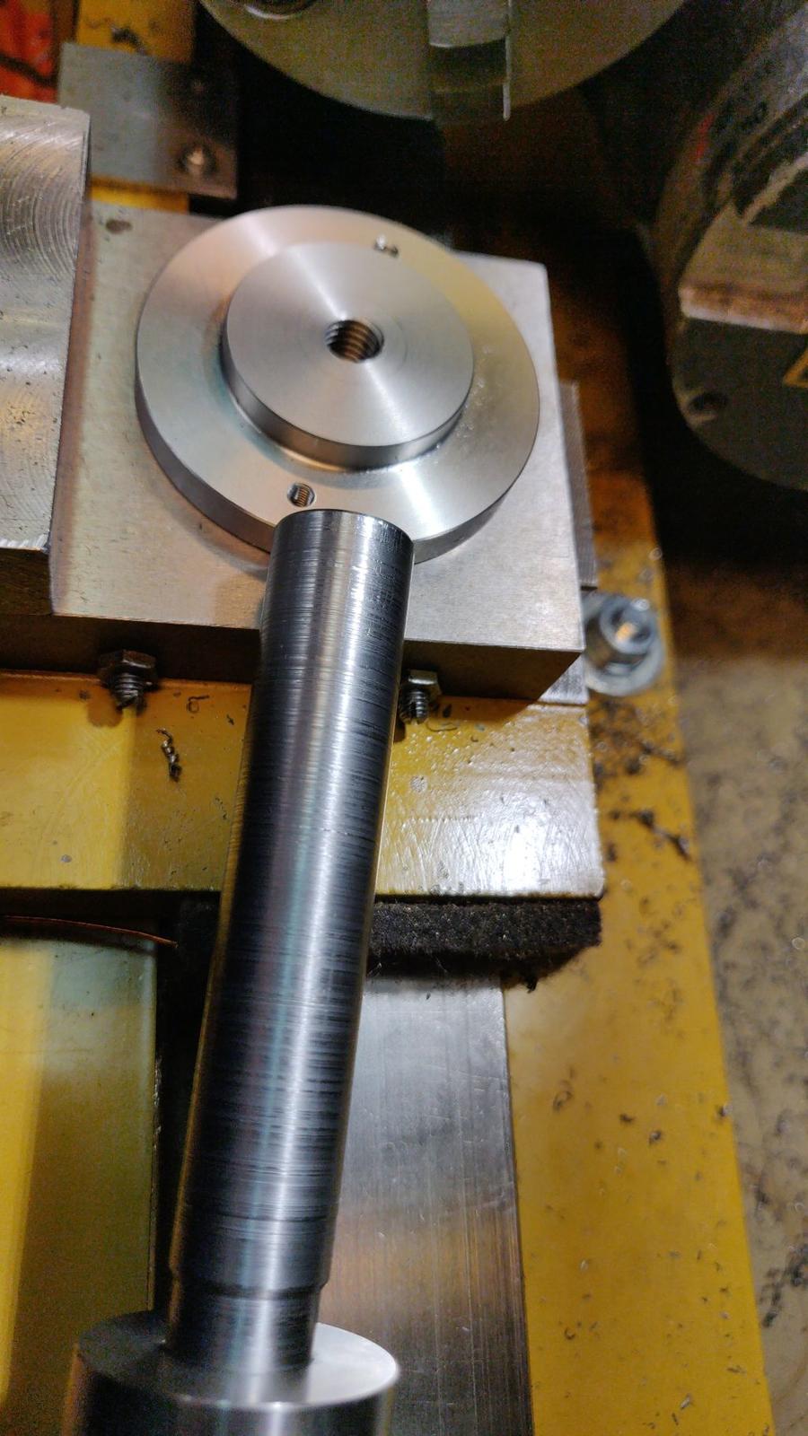 Wolfin kamppeissa tuli myös tällainen johteisiin kiinnittyvä pöytä. Alkuperäinen käyttötarkoitus vähän hämärän peitossa. Ajan saatossa joku vetässy siihen laikalla kolme railoa. Putsauksen jälkeen tästä kasvoi idea, että tostahan voisi tehdä pienen sahan vaikka halkaisuja varten. Tilasin 100mm HSS terän ja tein sille karan. Osa romuloota murikoita ja itse akseli Puuilon vedettyä tankoa. Tästä myöhemmin. Laippa kiinni akseliin lämpösovitteella. Kellotuskuva jäi ottamatta, mutta suoruus meni satasen sisään.