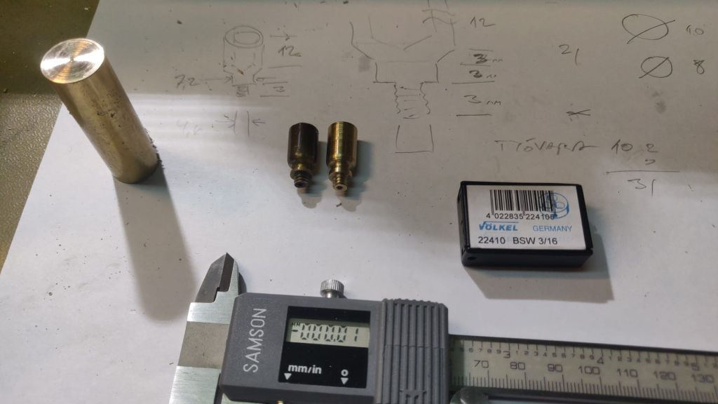 Kierteiden osalta tälä Wolf on outo tapaus. Vaikka saksalainen kone puolet kierteistä tuumaisia ja lisäksi epästandardeilla nousuilla. Ensimmäisessä kuvassa näkyvä putkihäkki missä moottori ollut kiinni kasattu ja kiinitetty UNC ruuveilla. Kitapalan ruuvit tunnistettu UNS 1/4-24 kierteeksi. Minipakasta löytyi ruuvit 3.2mm x 0.6 kierteellä. Pakka mikä muuten on englantilainen Burnerd on kiinni karaputkessa noin 20mm 11tpi Witworth kierteellä.