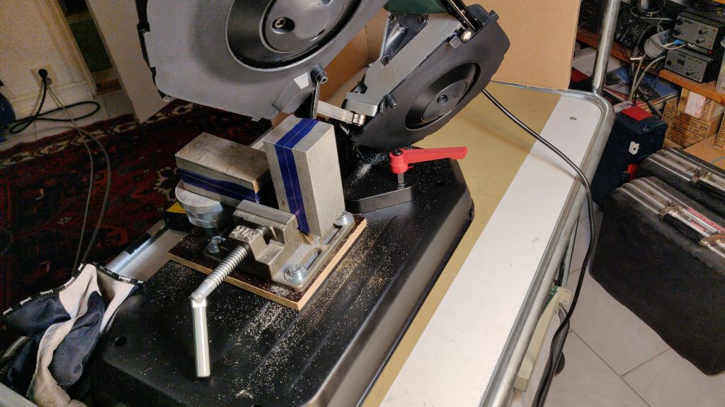 Laakeripukki- ja vetomutteriaihioita valmistamaan. Tässä hyvä tulikoe Liiterin sahalle. Materiaalia kun ei löytynyt muuta lähellekkään sopivaa kuin 50x50 alumiinitankoa. Pulikoiden halkaisu onnistui yli odotusten. Suora sahaus ja hyvä jälki. Tämä kikka on varmasti tiedossakin: Alumiinin sahaus ja koneistus sujuu helpommin kun käyttää leikkuunesteenä tenua.