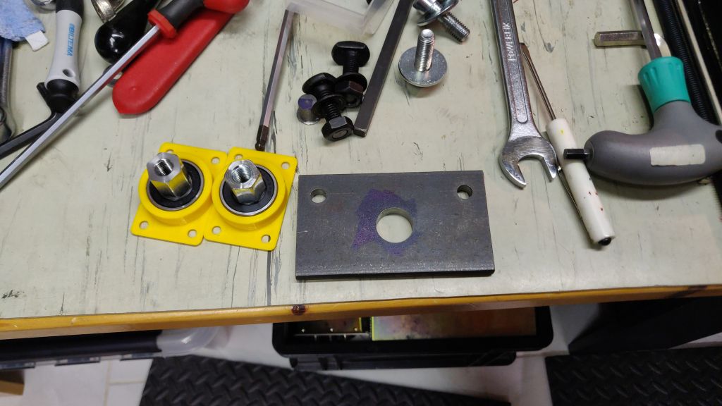 Olin nähnyt jo etäisen vision, että teen uudet ruuvit läpi pöydän ja laakerit molempiin päihin. Näin rakenteesta saa lähes välyksettämän. Ainoastaan vatomutterin klappi jää jäljelle.
