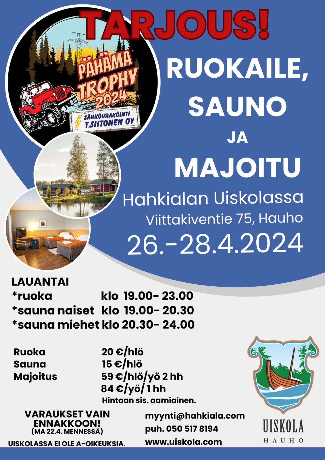 Pähäma Trophy 27.04.2024Pähäma Trophy by Sähköurakointi T.Siitonen Oy Lämpimästi tervetuloa ensimmäiseen Hämeessä järjestettävään offroad suunnistus tapahtumaan. Vuosia on kyselty miksi Päijät-Hämeen Maastoautoilijat ei ole järjestänyt tapahtumia, niin nyt on semmoinen päätetty järjestää. Tavoitteemme on saada tapahtumasta monivuotinen. Tapahtuman paikkana on kuvankauniit maisemat Hauhon seudulla. Maastoa löytyy kivikoista soisiin metsiin ja ajettavaa on niin vakioille, kuin rakennetuimmille ajoneuvoille. Tapahtuman ajankohta on keväinen 27.04.2024 Hauhon Porsoossa. Kilpailukeskuksen osoite on Porsoontie 303, 14770 Eteläinen. Tavoitteemme on saada ilmoittautuminen auki pääsiäiseen mennessä. Kannattaa ehdottomasti hyödyntää majoituspalvelun tuottajaa Hauholla. Majoitusta on tarjolla kauniissa miljöössä Hahkialan kartanon Uiskolassa. Sieltä löytyy hotellimajoitusta aamupaloineen ja muutama isompi asunto. Lauantaina on myös mahdollista ostaa lisähinnasta iltaruokailu ja sauna. Pihalta löytyy myös muutama sähköpaikka. Yhteistiedot: myynti@hahkiala.com 0505178194 (mainos liitteenä) Kilpailunjohtaja: Katri Tervala 0407713153 katri.tervala01@gmail.com Mikäli heräsi mielenkiinto lähteä tukemaan uutta tapahtumaa, niin ottakaa ihmeessä yhteyttä kilpailunjohtajaan. Esimerkki sponsori paketista, 1 paketti 150€ ja 2 paketti 300€. Halutessanne toimitamme mediapaketin sähköpostiinne.