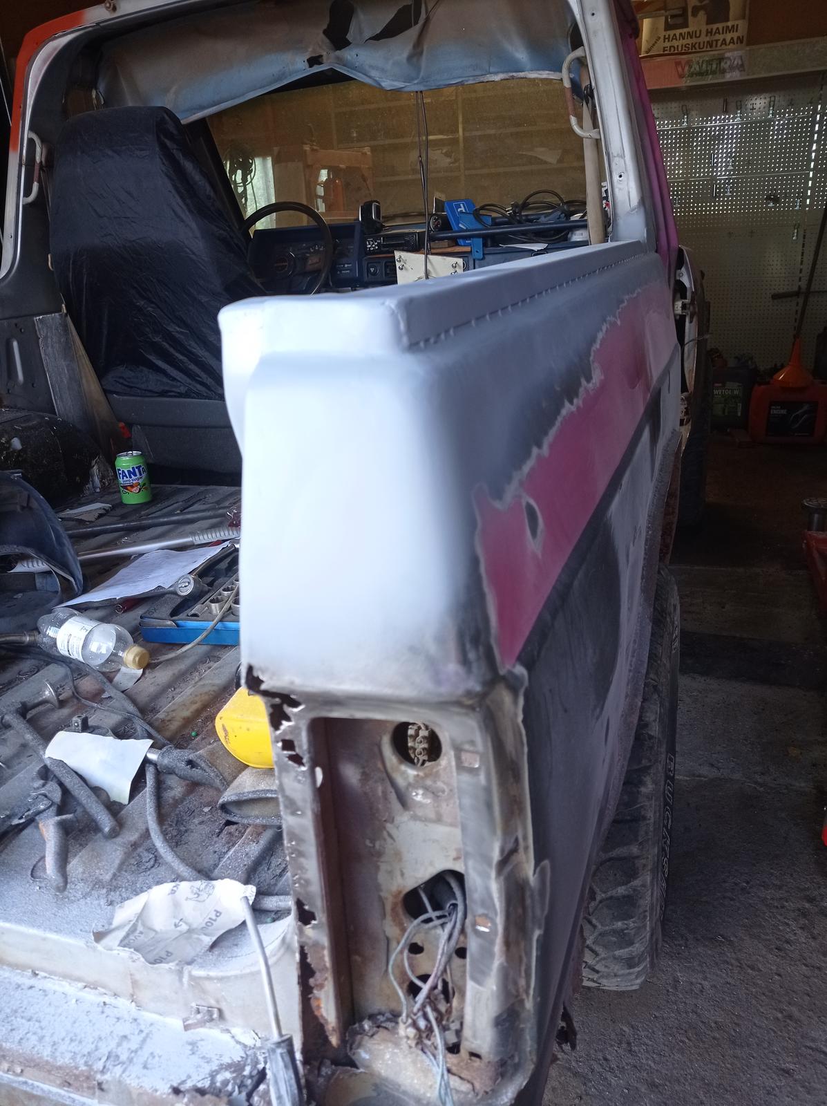 En ole laskenut Voi olla että menee vielä reilusti lisää. Tähän mennessä ei ihan niin paljon kuitenkaan, kun voisi kuvitella. Nuo katon reunat on kyllä aika työläät ja menee paljon peltiä, kun on kaksi kerrosta peltiä, tuon kotelorakenteen takia. Loppujen lopuksi tuo pätkä on kuitenkin huomattavasti helpompi hitsailla, kun pinta-alaa on aika paljon vähemmän kuin pitkässä. Etenkin kun on irrotettava takakatto.