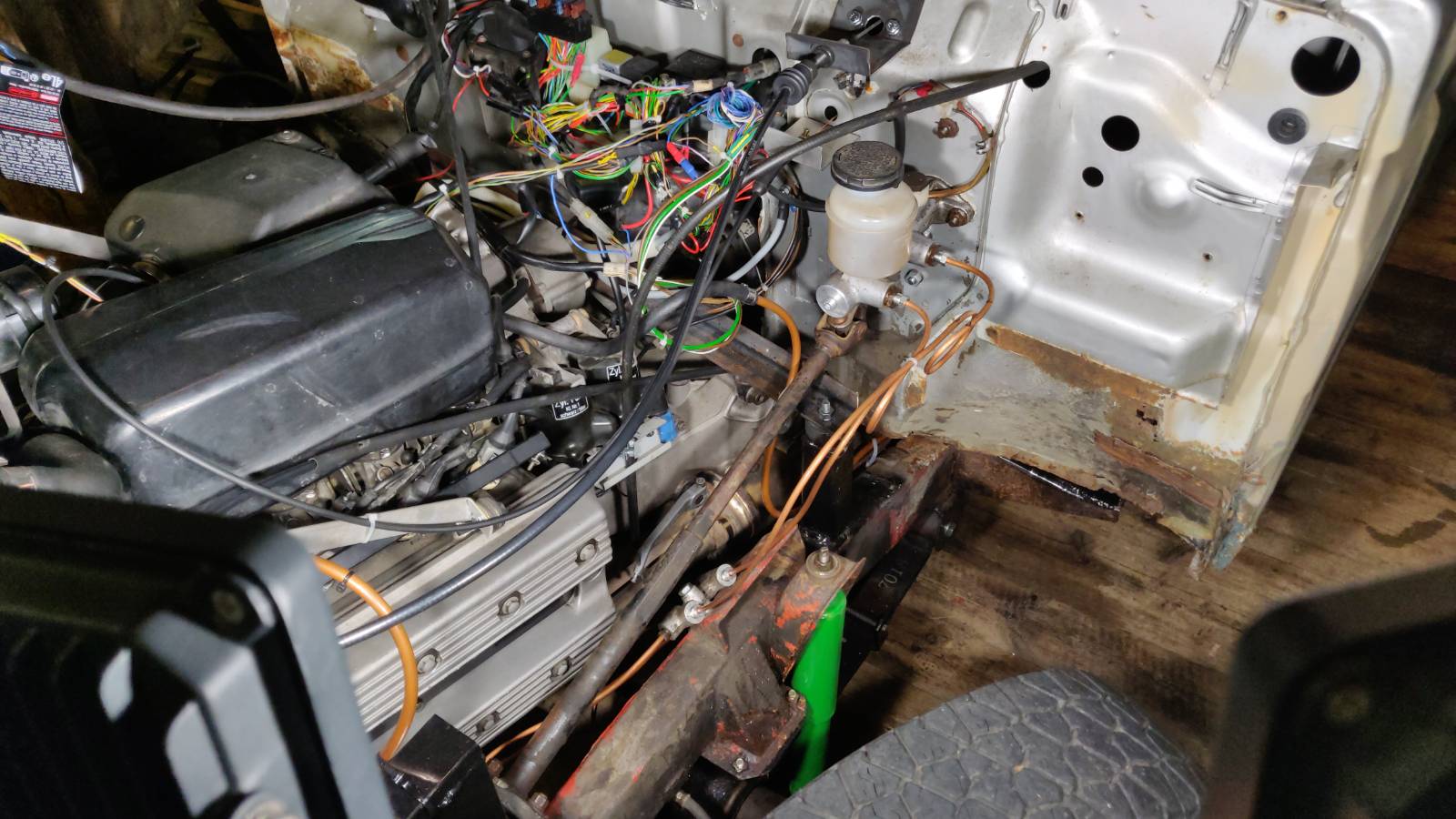 Sähkölaitteiden osasijoittelun määräsi lähinnä Bemarin johtosarja. Kaikki kama kannattaisi tietysti sijoittaa hytin puolelle, mutta ei jaksanut ainakaanan tässä vaiheessa tekemään uutta johtosarjaa. No jotain osia kuten ruiskun aivot pääsi kabiinin puolelle.