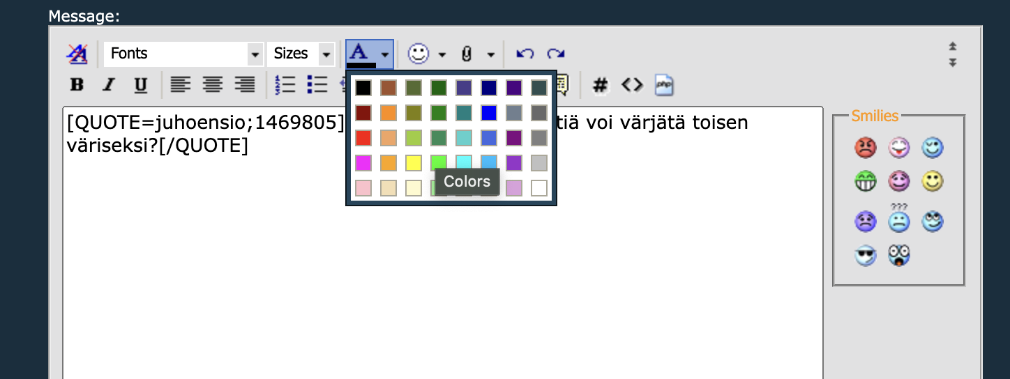 Kannattaa vaan ottaa huomioon, että palstan ulkoasu voi olla valittuna sivun ääri-vasemmasta (yök) alakulmasta eri väriseksi jokaisen oman mieltymyksen mukaan, niin kaikki värit ei oikein näy eri värisillä taustoilla. Ja useimmiten yksinkertainen on kauneinta ![]() Itse siis käytän palstaa 99.9% tietokoneella, puhelimella en ole noita toimintoja koskaan kokeillut. Edit: Jouni oli nopee, mutta en silti taida poistaa tuota suurella vaivalla 2-sormijärjestelmällä muotoilemaani vastausta