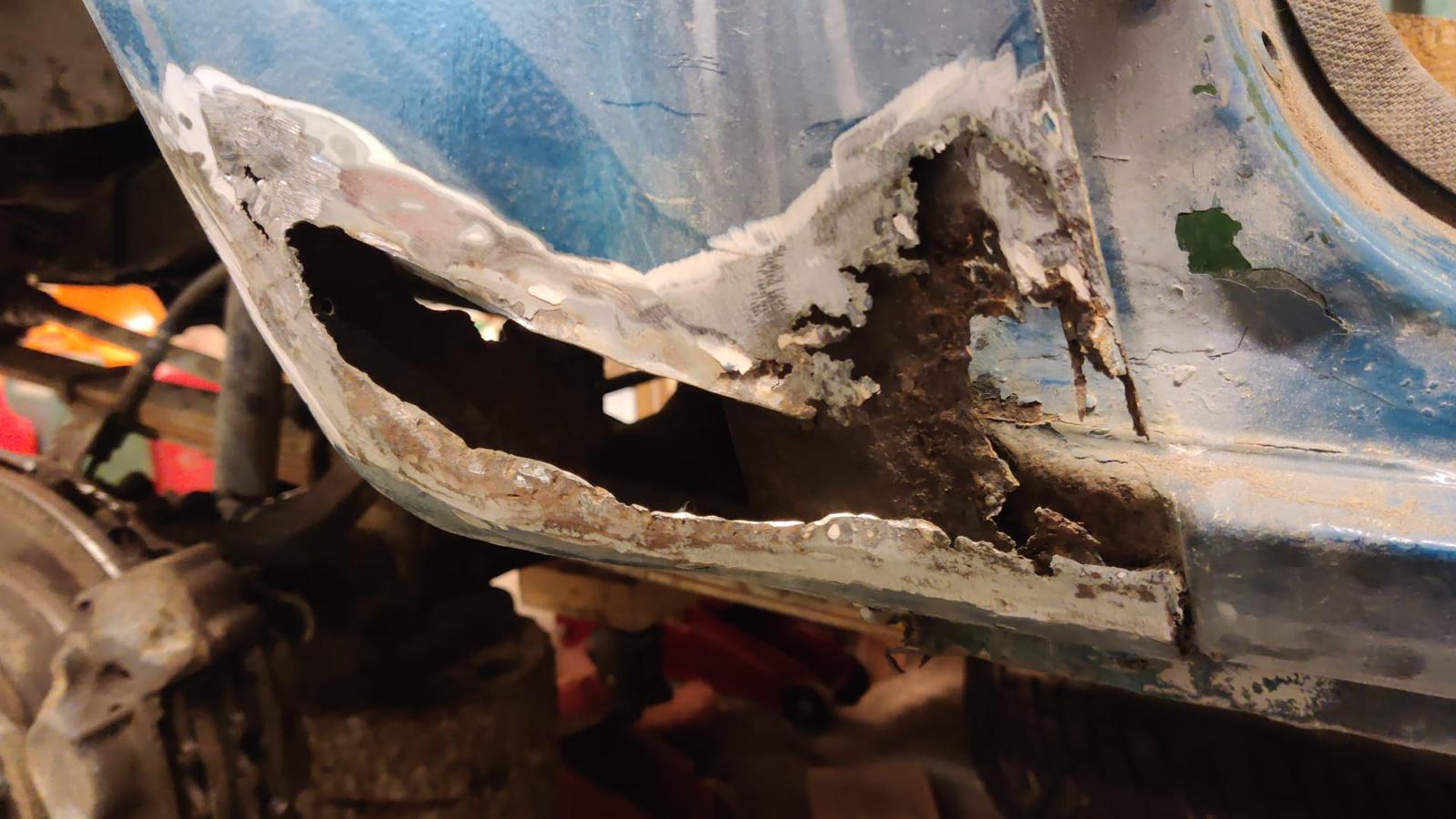 Kuskin jalkatilassa oli jo edellisten vuosikymmenten tilkkutäkit, mutta niiden jatkoksi sai siististi tehtyä jatkopalaa... Muuten kori itsessään olikin suuresti ruosteeton, sillä edellinen käyttäjä oli ruostesuojannut kaiken hyvin kattavasti. |