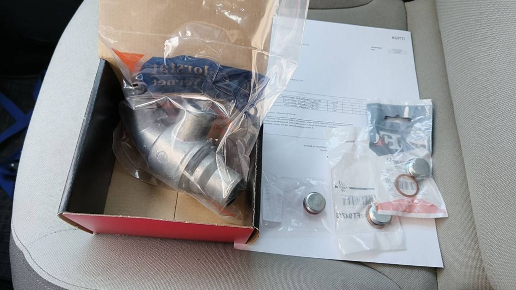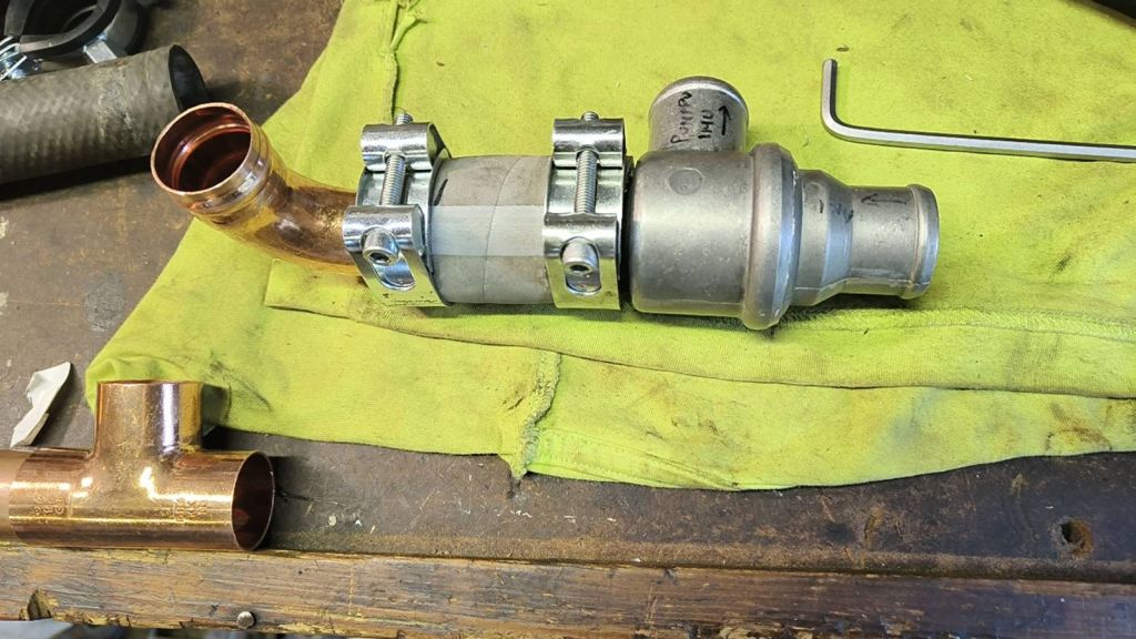 Optio 1.0 oli tehdä kääntö väärään suuntaan lähtevälle ohivirtausportille vesijohtomuhveista. Ajatus ei kantanut kovin pitkälle. Termari sorviin ja turhat vekit suoraksi. Pätkä letkua kunnon klemmareilla ja 90 vinkkeli perään niin alettiin olemaan oikeassa linjassa. Osa asennusvalmis. |