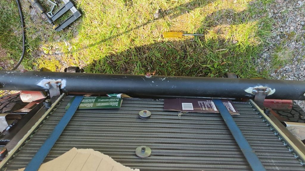 Varastosta löytyi aikanaan Juuson valkoiseen Suzukiin putkesta tehty "hätäpuskuri". Sopi tähän projektiin bolt on. Samalla ratkesi syylarin kiinitys. Yksinkertainen on kaunista. Pari latan pätkää puskuriin ja kiinikkeet oli siinä. Samalla vauhdilla syylarin etupuolelle vielä tollanen puskasuoja. Putkien taakse tulee vielä verkko. |
