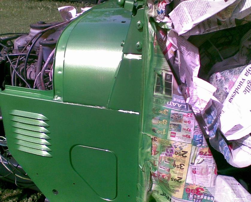 Nokkapelti oli melko ruttunen, todennäköisesti pamahtanut auki "kovassa" vauhdissa tms.. Maalia on sen verran monta kerrosta että hiomista helpommalla pääsi kun käytti kuumailmapuhallinta ja mettallista skrapaa. Eli kaikki maalit pois. Ja kun nakuttelemalla ei sitä täysin suoraksi saanut niin joutuu laittamaan pakkelia |