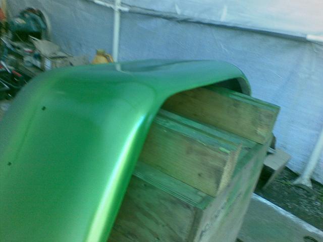 Nyt on saatu maalia pintaan ja vihreähän siitä tuli. Maali on vesiohenteista metallinhohtovihreää. Lakkaa on laitettu päälle noin kolmisen kerrosta. Tässä pari kamerakännykkäkuvaa