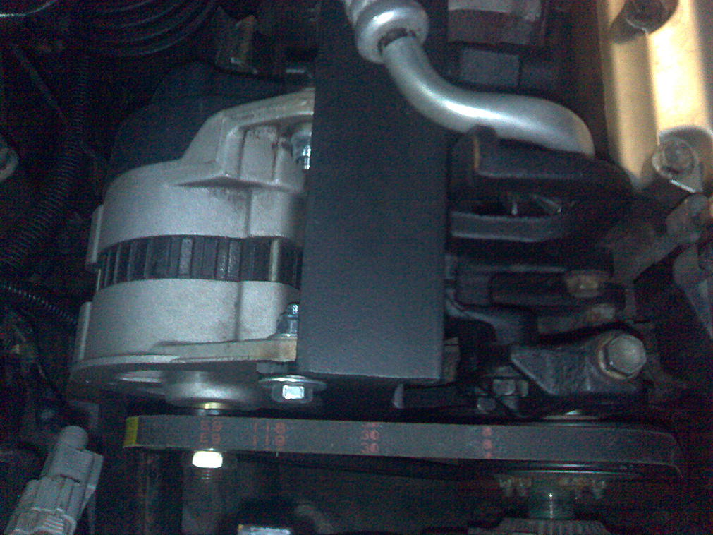 Tässäpä muutama kuva, hieman sumeita kylläkin. Eli lohkon kylkeen tulee edelleenkin kiinni alkuperäinen kompuran pidike ja laturi on kiinni pulteilla siihen tehdyssä adapterissa. Adapterikin on pulteilla kiinni alkuperäisessä kompuran kiinnikkeessä. Laturi on kiinnikkessään kiinteästi koska alkuperäinen hihnankiristin oli mielestäni toimiva. Mitoitus sattui minulla kohdalleen hyvin koska alkup. kompuran hihna kävi tähän uuteenkin viritykseen. Letkut jotka kuvissa näkyvät ovat ilmastoinnin letkuja, en ole niitä vielä kerenny pois repiä.