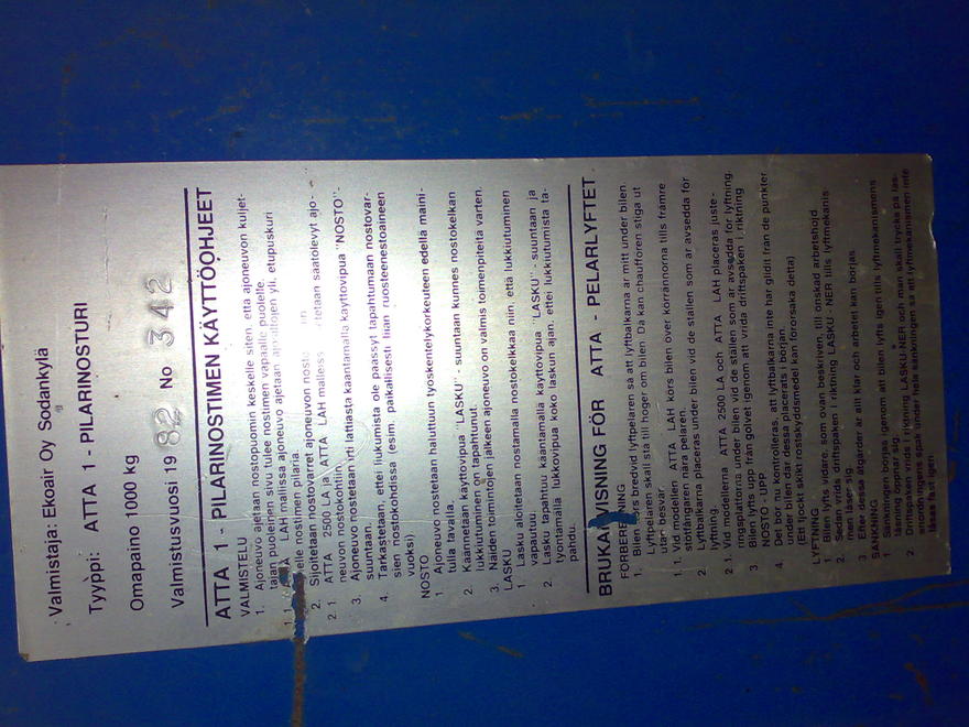 1-pilarinosturiMyydään ATTA 1 -pilarinosturi, vanha kuin taivas mutta toimii kuin tupakki. Nimellisnostokyky 2500kg, omamassa 1000kg.Tossa romuläjän alla se on, tarvikkeet mukaan. Laite Espoossa, kuljetus maksua vastaan järjestyy. Hintaa 2000€, soitot 10-22 Myydään Viimeksi muokannut Uazmies : 15.01.2012 13:04 |