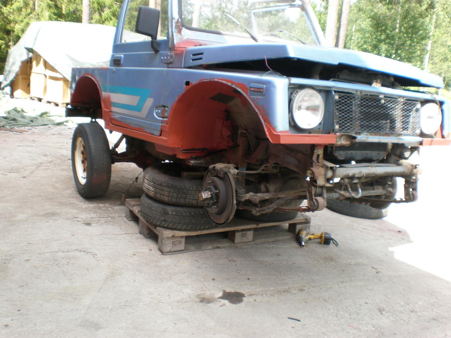 Samurain askartelua (Projekti nimeltä Froggy)Vähän tarinaa suzukin rakentelusta. Eli otetaan käsittelyyn lievästä norjankromista kärsivä samurai. Tästä oli helppo aloittaa, kun oli nuo pyörän kaaret jo valmiiksi suurentuneet,eikä tarvinnu helmojakaan paljo poistella palkkien tieltä.