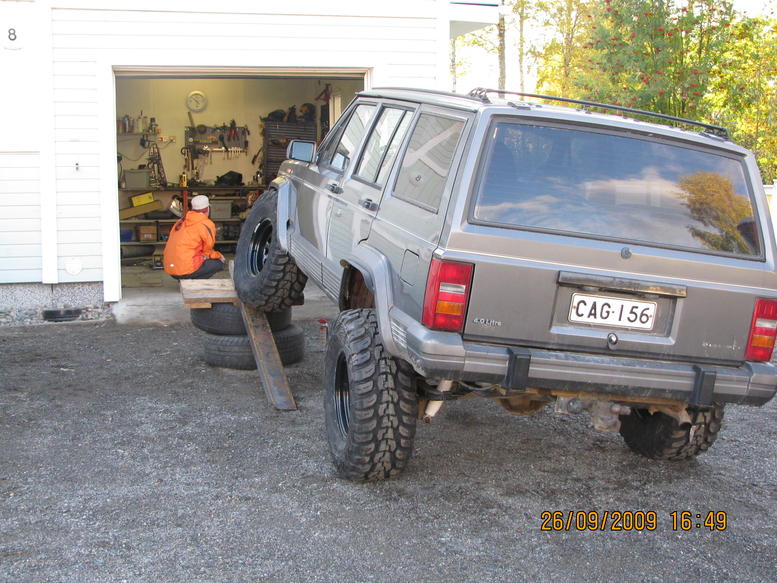 "KAKI" uuteen nousuunrunnerin lähdettyä taipaleelle pihaan ilmestyi kuvan kaunis 91 vuoden cherokee hetken mielijohteesta.edullinen hinta houkutteli ja kun visioita rupesi lentämään enemmän kuin finnairin koneita niin katsotaan mitä tästä nyt sit tulee vai tuleeko mitään.karmea nimi kaki jountaa juurensa työkaverin väläytykseen kilpeen perustuen,kiitos silverille! kinnerin pitäisi ruokkia myös käyttöauton virkaa niin ei aivan mahottomiin voi mennä,toistaiseksi. heti tlattiin RoughCountryn 3" korottava setti ja kunhon kl-71 renkaat kokoa 33/12.5-15.vanteita ei vielä ole kun koko tai pikemminki ET mietinnässä.vinssi jo kovasti menossa keulaan,palkkipuskurin kera,vaiheessa. alustakin tuli ja meni myös paikalleen kahden miehen hillittömän ähkimisen jälkeen.pultit oli mielettömän tiukassa takajousilla,ei meinannut lämpö,lyönnit ja crc auttaa ollenkaan.10 tunnin tappelun jälkeen saatiin auto takasi pyörilleen. itselle nää jeepit on vielä vierasta aluetta joten kaikki vinkit yms on tervetullutta. jatkuu....