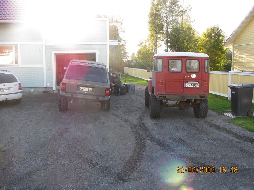 "KAKI" uuteen nousuunrunnerin lähdettyä taipaleelle pihaan ilmestyi kuvan kaunis 91 vuoden cherokee hetken mielijohteesta.edullinen hinta houkutteli ja kun visioita rupesi lentämään enemmän kuin finnairin koneita niin katsotaan mitä tästä nyt sit tulee vai tuleeko mitään.karmea nimi kaki jountaa juurensa työkaverin väläytykseen kilpeen perustuen,kiitos silverille! kinnerin pitäisi ruokkia myös käyttöauton virkaa niin ei aivan mahottomiin voi mennä,toistaiseksi. heti tlattiin RoughCountryn 3" korottava setti ja kunhon kl-71 renkaat kokoa 33/12.5-15.vanteita ei vielä ole kun koko tai pikemminki ET mietinnässä.vinssi jo kovasti menossa keulaan,palkkipuskurin kera,vaiheessa. alustakin tuli ja meni myös paikalleen kahden miehen hillittömän ähkimisen jälkeen.pultit oli mielettömän tiukassa takajousilla,ei meinannut lämpö,lyönnit ja crc auttaa ollenkaan.10 tunnin tappelun jälkeen saatiin auto takasi pyörilleen. itselle nää jeepit on vielä vierasta aluetta joten kaikki vinkit yms on tervetullutta. jatkuu....