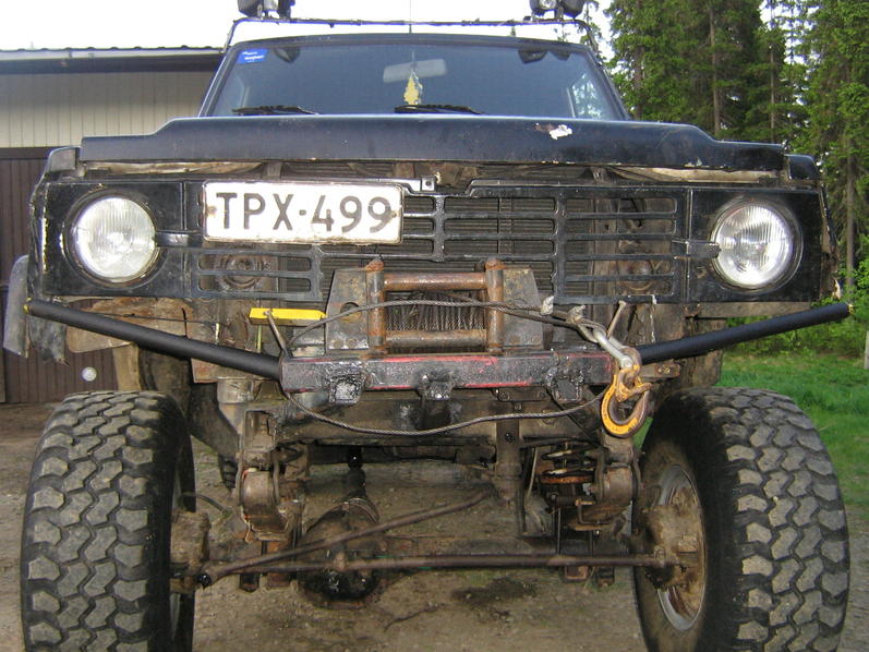 Käytiin tuossa "tossavaisen" kanssa kokeilemassa autoja kestääkö, no kyllä molemmat tuli ajamalla pois metsästä. renkaat pitäs paremmat olla karkeammat ainaki.. itselle etuvalo säpäleiksi, joitain lommoja, vinssin vaijeri poikkisiinäpä sitä. visko pitäs kirrata että pitäs kunnolla. olisko ohjeita kiristykseen..?